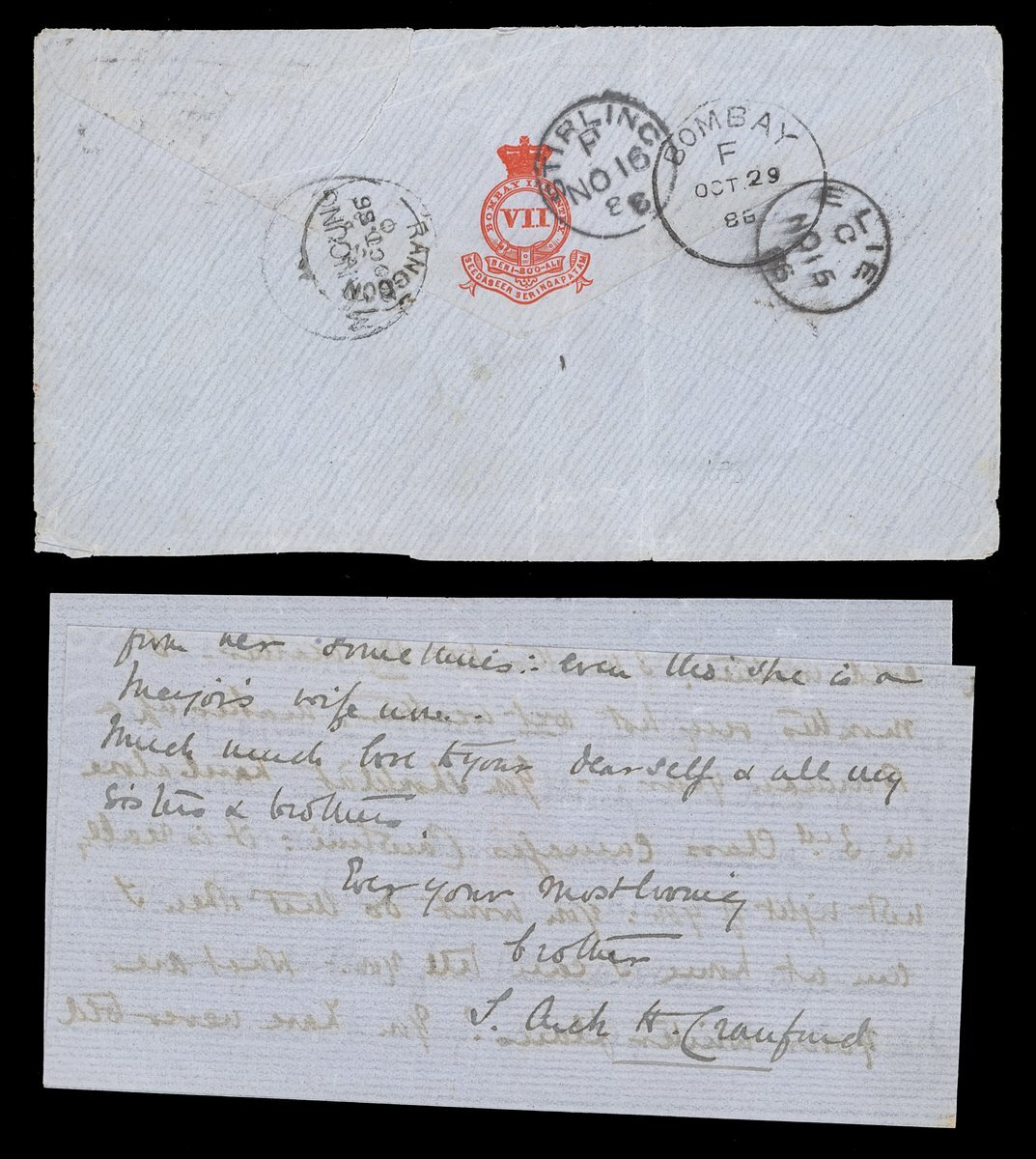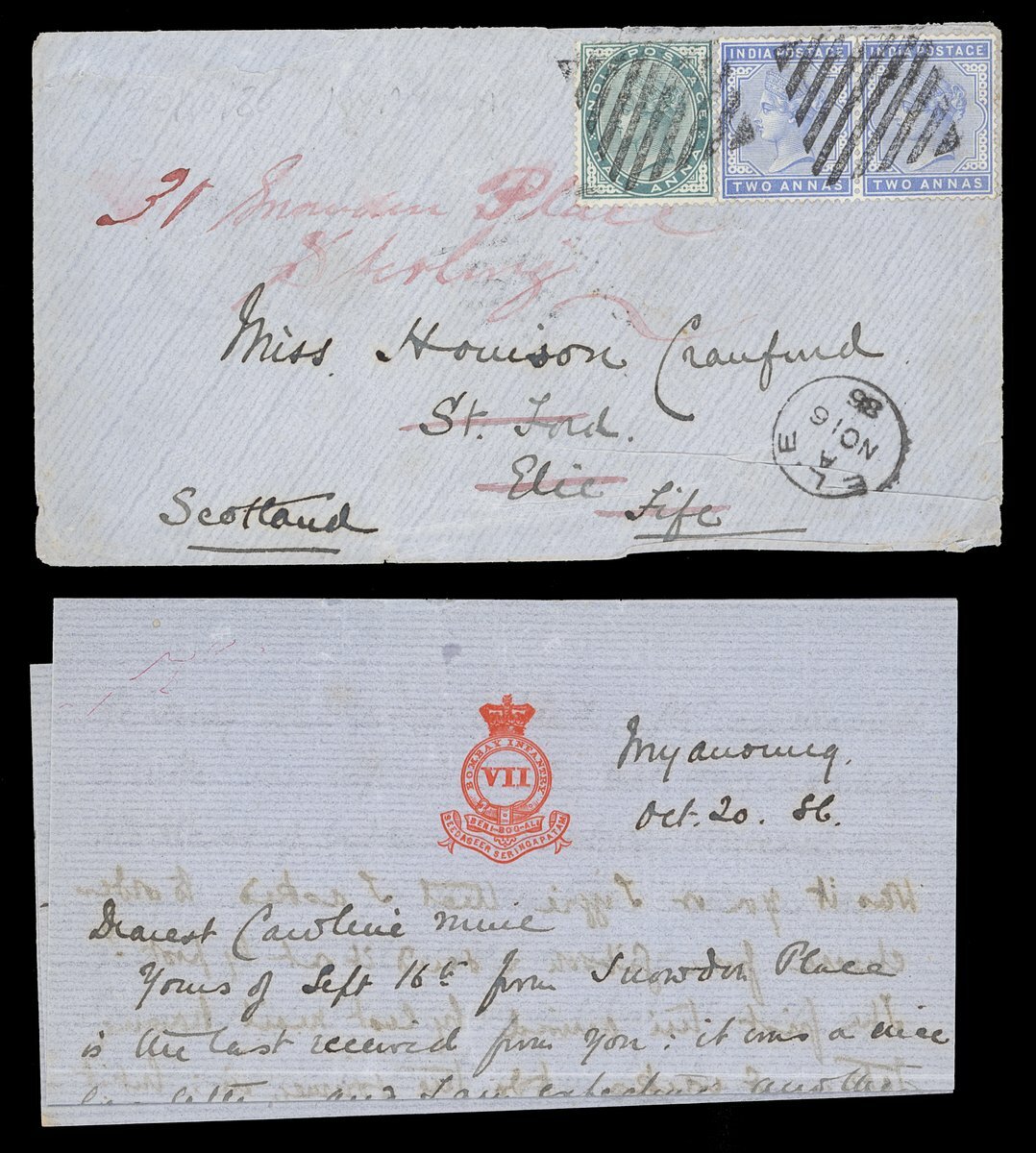1886 (20 Oct.) envelope (with letter) to Scotland (re-addressed internally), bearing ½a. and 2a. pair tied by diamond of bars (Type K3) and showing, on reverse,