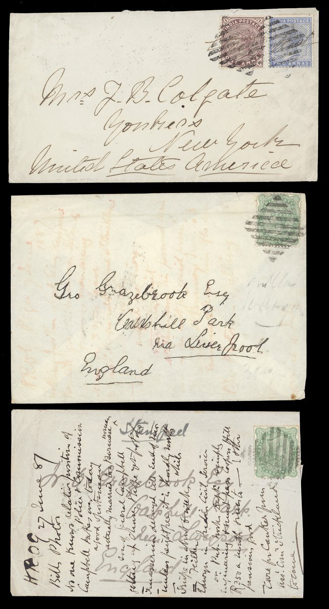 1887 (7 June) and (28 June) envelopes ex the Grazebrook correspondence (both with recipient's notation across face panel) to England bearing 2½a. and (13 Sept.) envelope to New York bearing 1a. and 2a., all tied by diamond of bars (Type K4) and showing, on reverse,