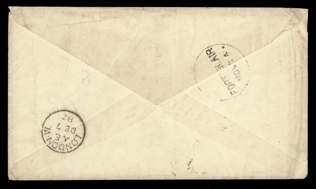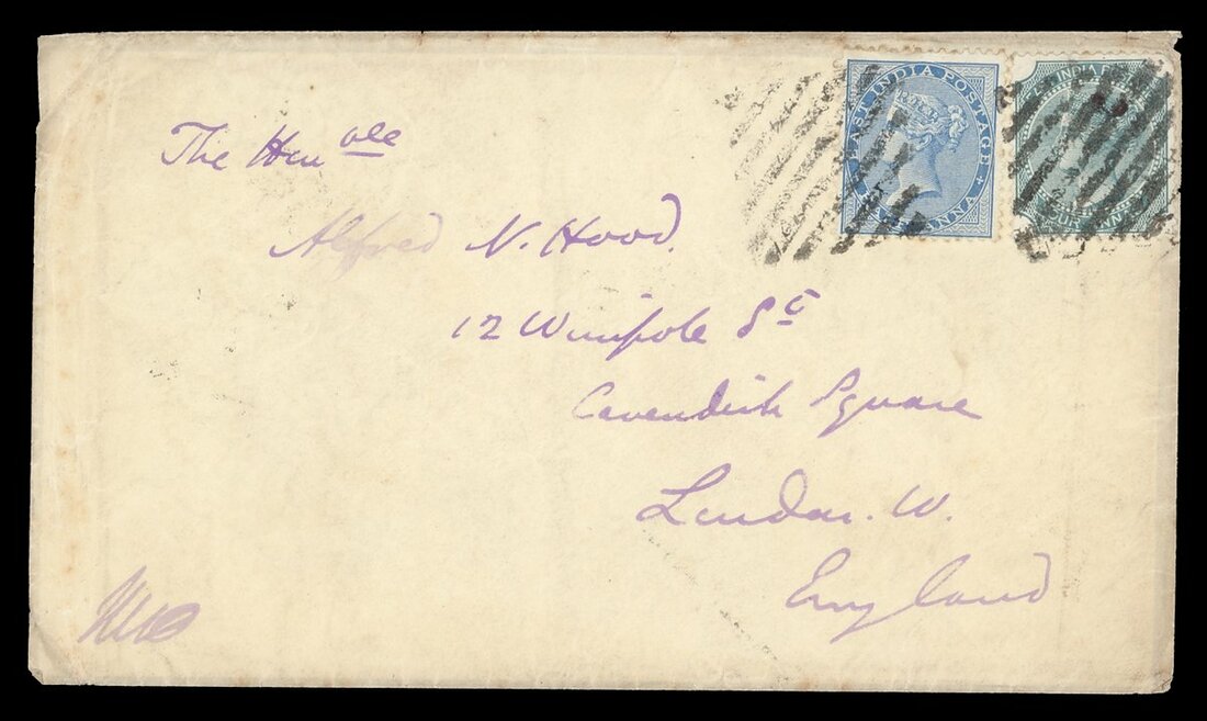 1882 (4 Nov.) envelope to London, bearing ½a. and 4a. tied by diamond of bars and showing, on reverse,