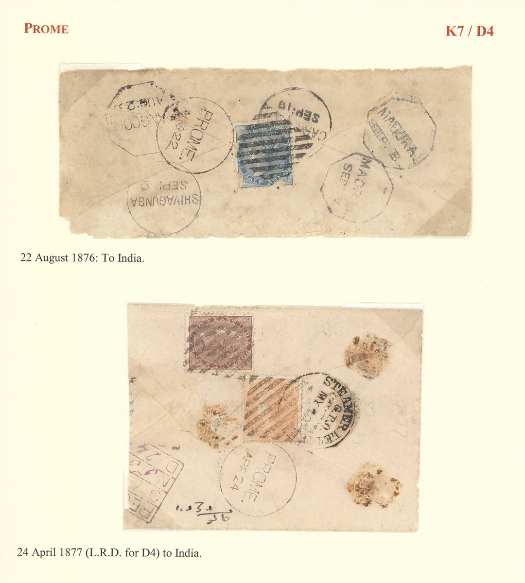 1876 (22 Aug.) envelope (small faults) to India bearing, on reverse, ½a. (defective), 1877 (24 Apr.) large part envelope to India bearing, on reverse, 1a. and 2a., all tied by diamond of bars (Type K7) and both showing