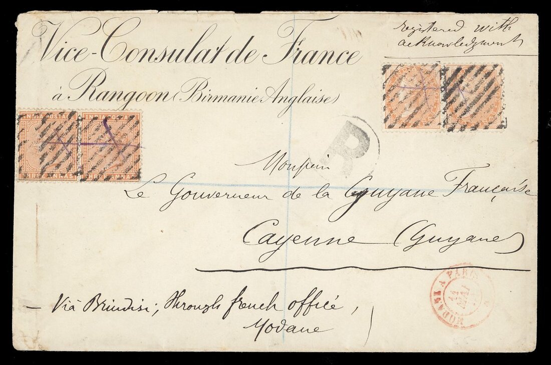 1884 (17 Apr.) envelope registered from French Vice-Consulate addressed to the Governor of French Guiana, marked "Via Brindisi through french office Yovane", bearing 2a. pairs (2) each with ink cross and cancelled by diamond of bars, showing "R", Modane a Paris transit d.s. in red and, on reverse, unrecorded framed