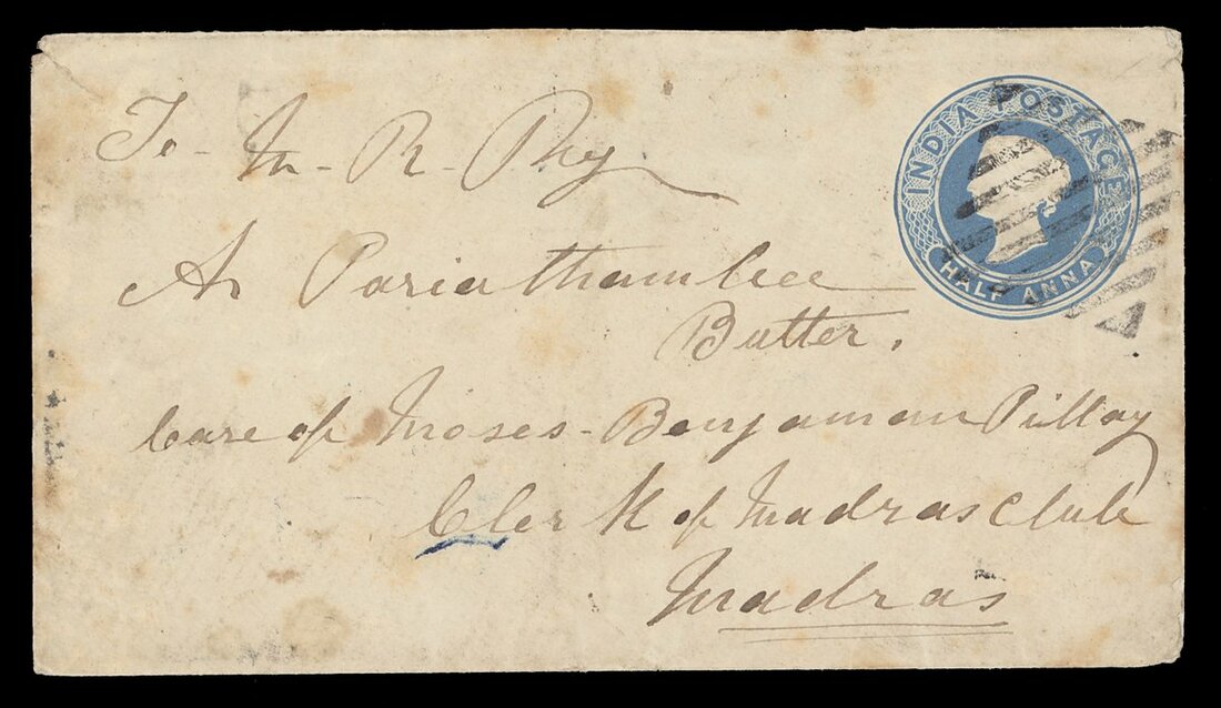 Undated envelopes (2, one with flap missing and the other with it part missing) franked at ½a. and 1a., and ½a. stationery envelopes (2, one a little stained) to India, all cancelled by diamond of bars (Type K7) and showing