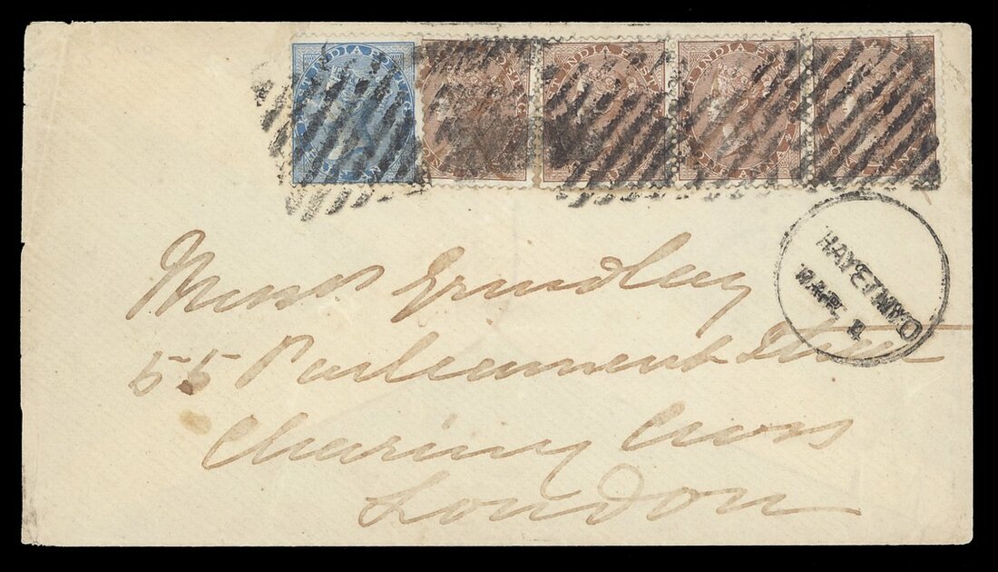 1880 (4 Mar.) envelope ex the Grindlay correspondence to London, bearing ½a. and 1a. (4), all cancelled by diamond of bars (Type K7; earliest recorded date) and showing