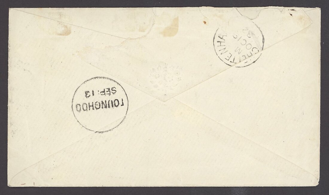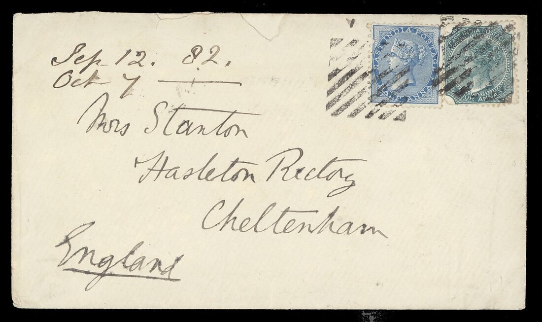 1882 (13 Sept.) envelope ex the Stanton correspondence to Cheltenham, bearing ½a. and 4a. tied by diamond of bars and showing, on reverse,