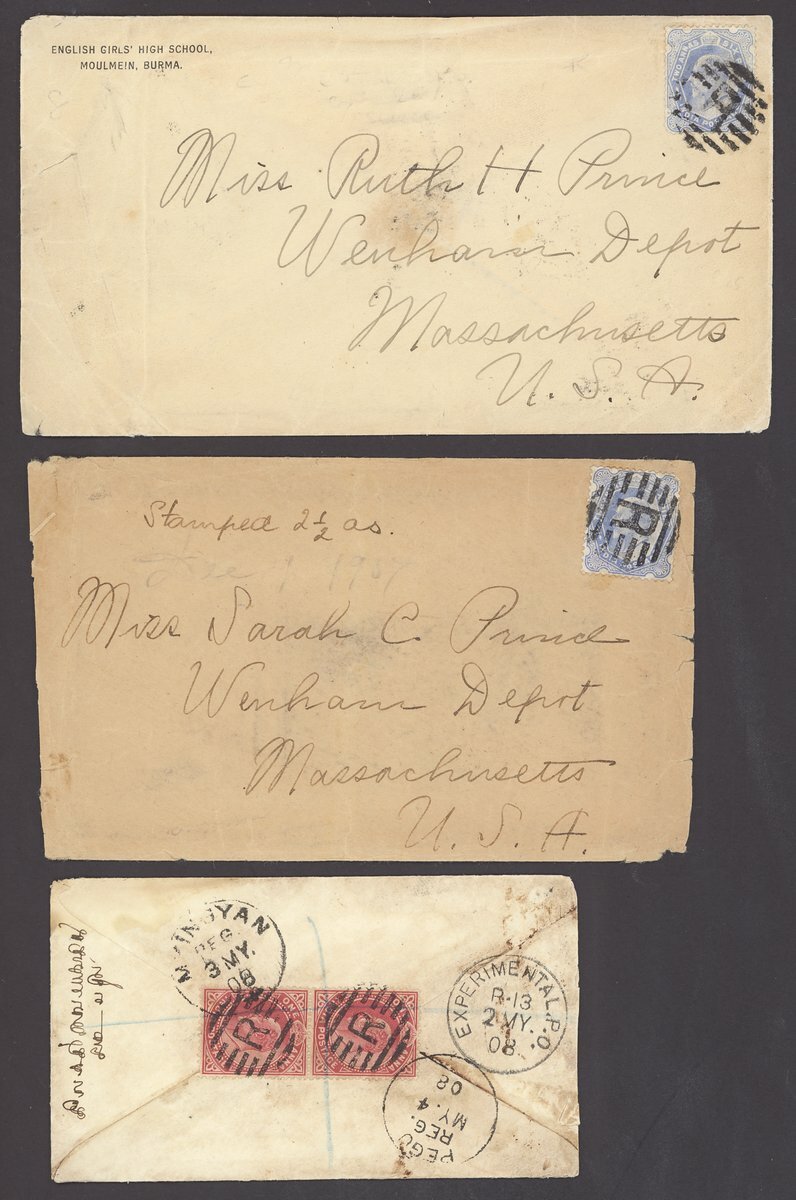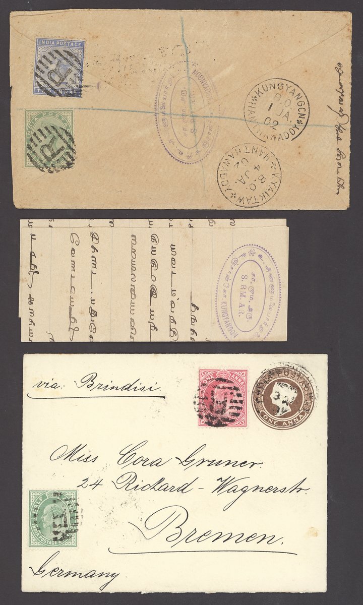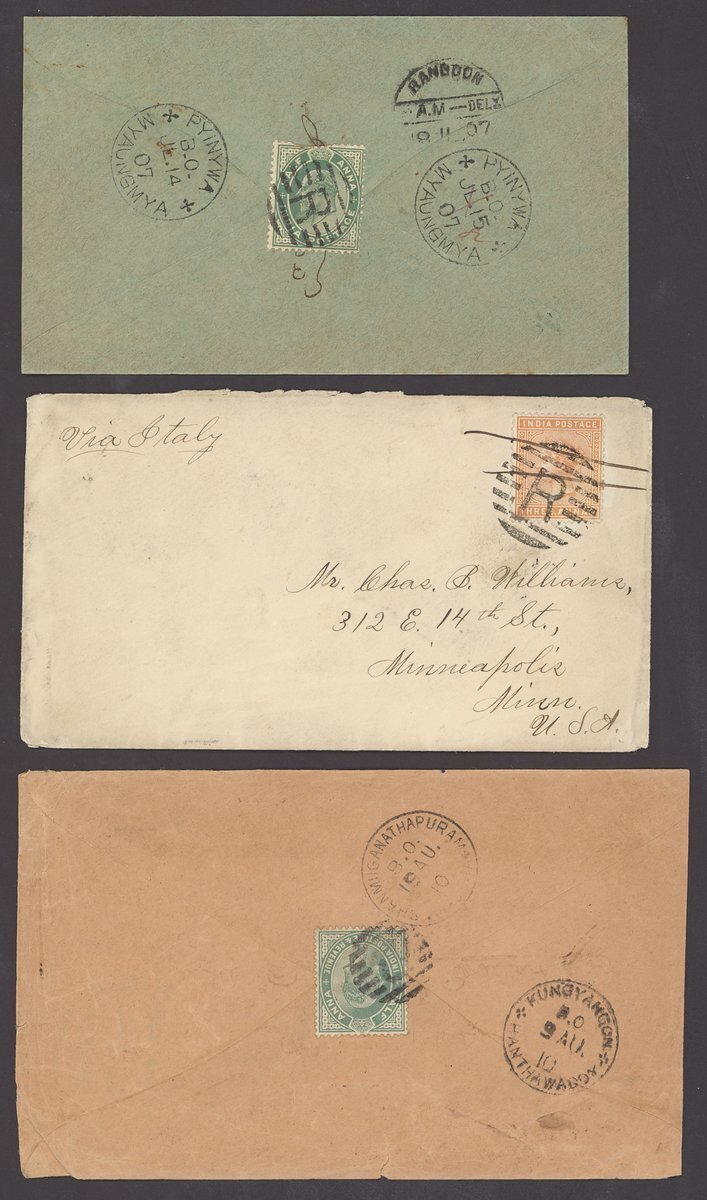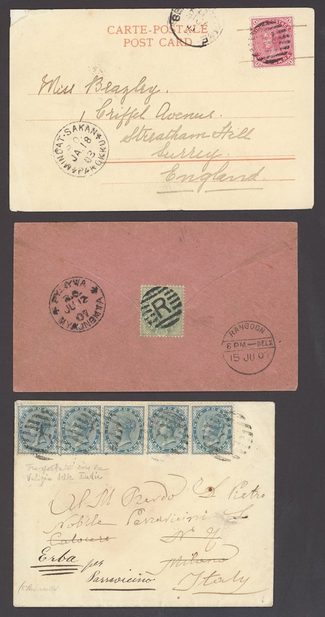 1886-1910 envelopes (16, one registered) and a picture postcard, variously addressed (one to Germany, one to Italy, two to UK and three to USA) and franked, datestamps including those of Kungyangon B.O./Hnthawaddy (Type D2; earliest recorded date), Kyeikpie B.O./Maubin (Type D1; only recorded date).Kyaikto (Type D2), Mindat Sakan B.O./Pakokku (Type D2; latest recorded date), plus Experimental R-10, R-11 (2) and R-13. A good lot well worth viewing