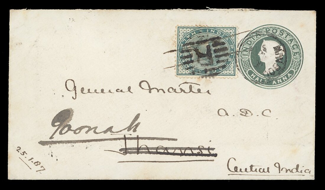 1887 (25 Jan.) ½a. stationery envelope to Jhansi and redirected to Poonah, cancelled by