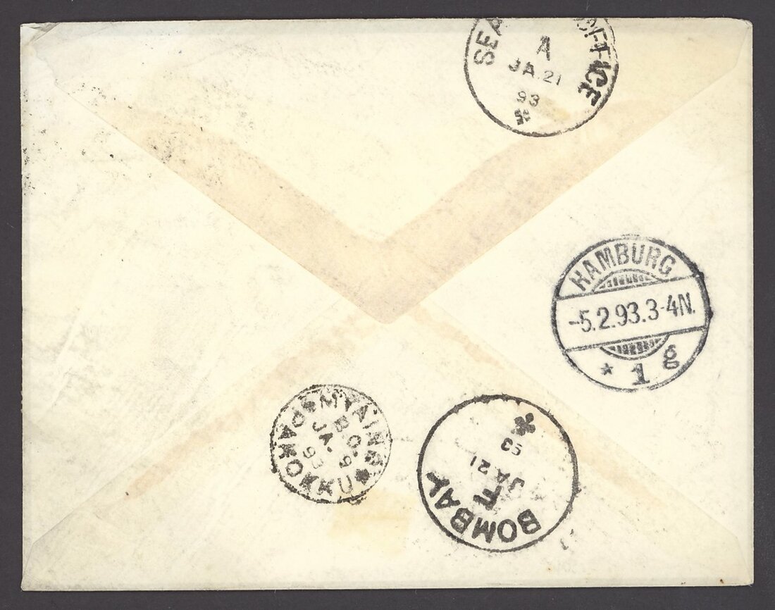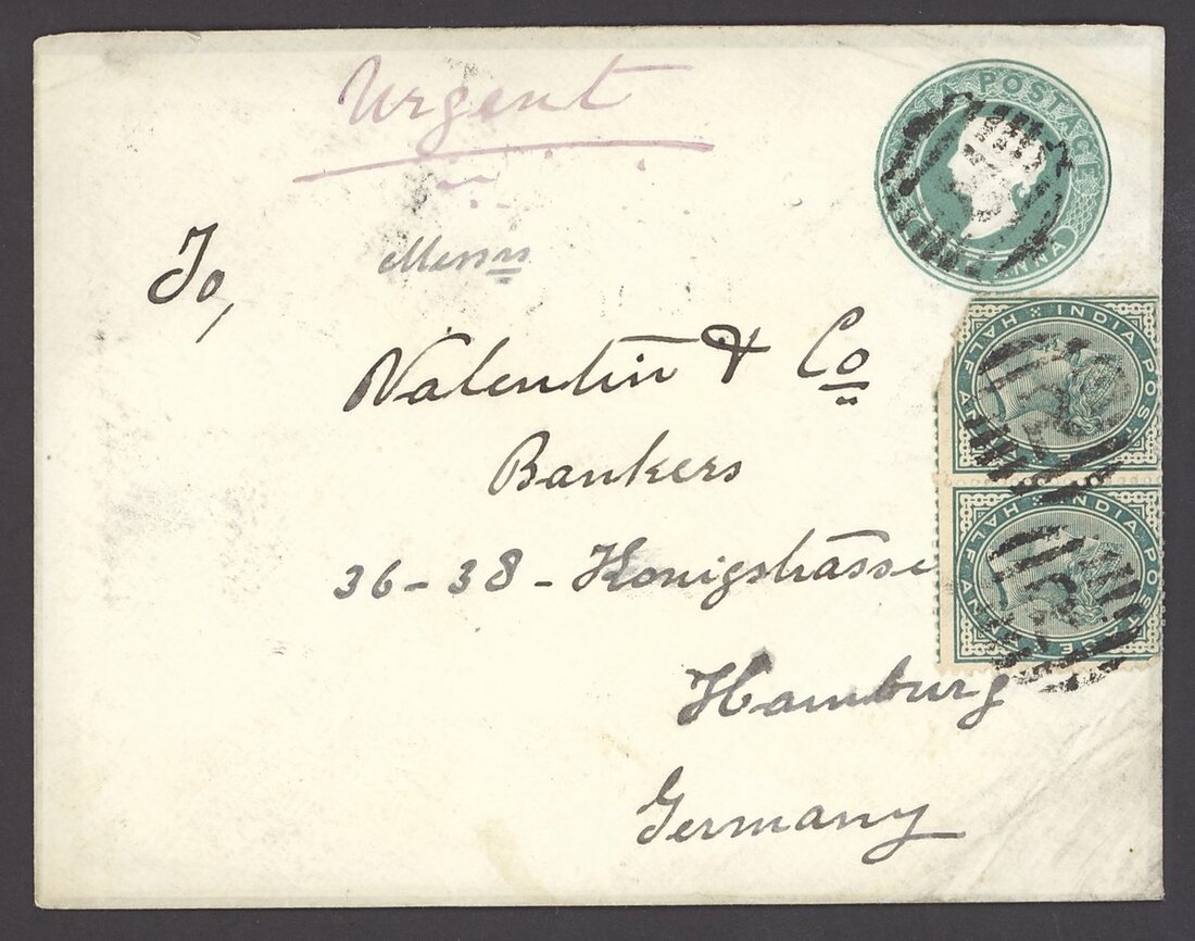 1893 (9 Jan.) ½a. stationery envelope to Hamburg, uprated with ½a. pair (one with defective corner), each cancelled by