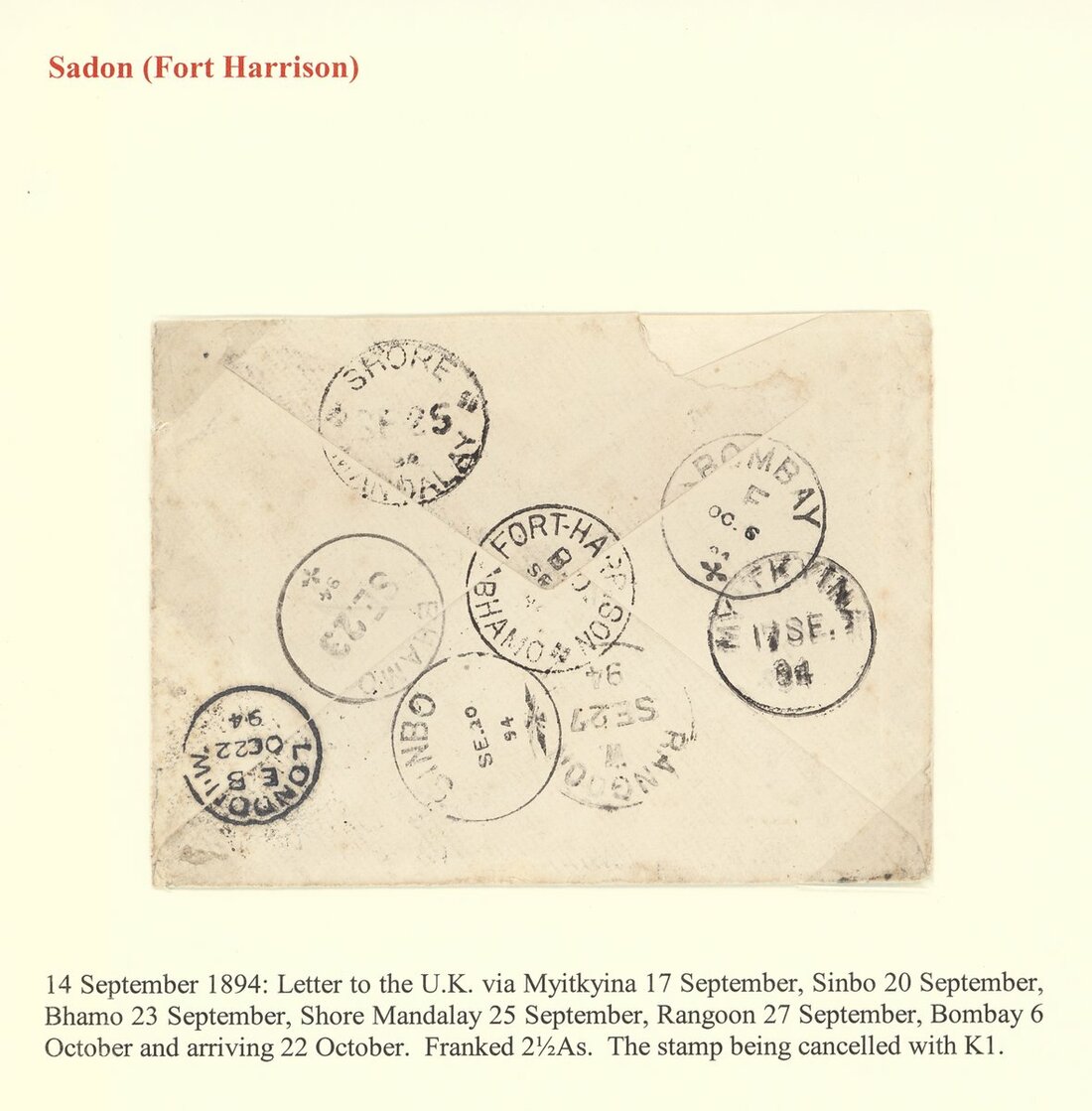 1894 (14 Sept.) envelope to London, bearing 2½a. centrally cancelled (not tied) by