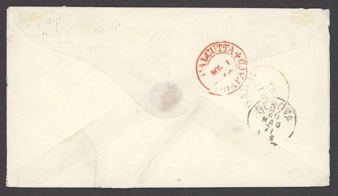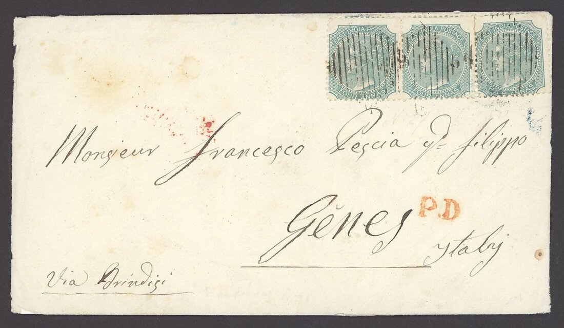 1871 (18 Apr.) envelope ex the Pescia correspondence to Genoa, bearing 4a. pair and single each cancelled by diamond of 16 thin bars, showing unframed