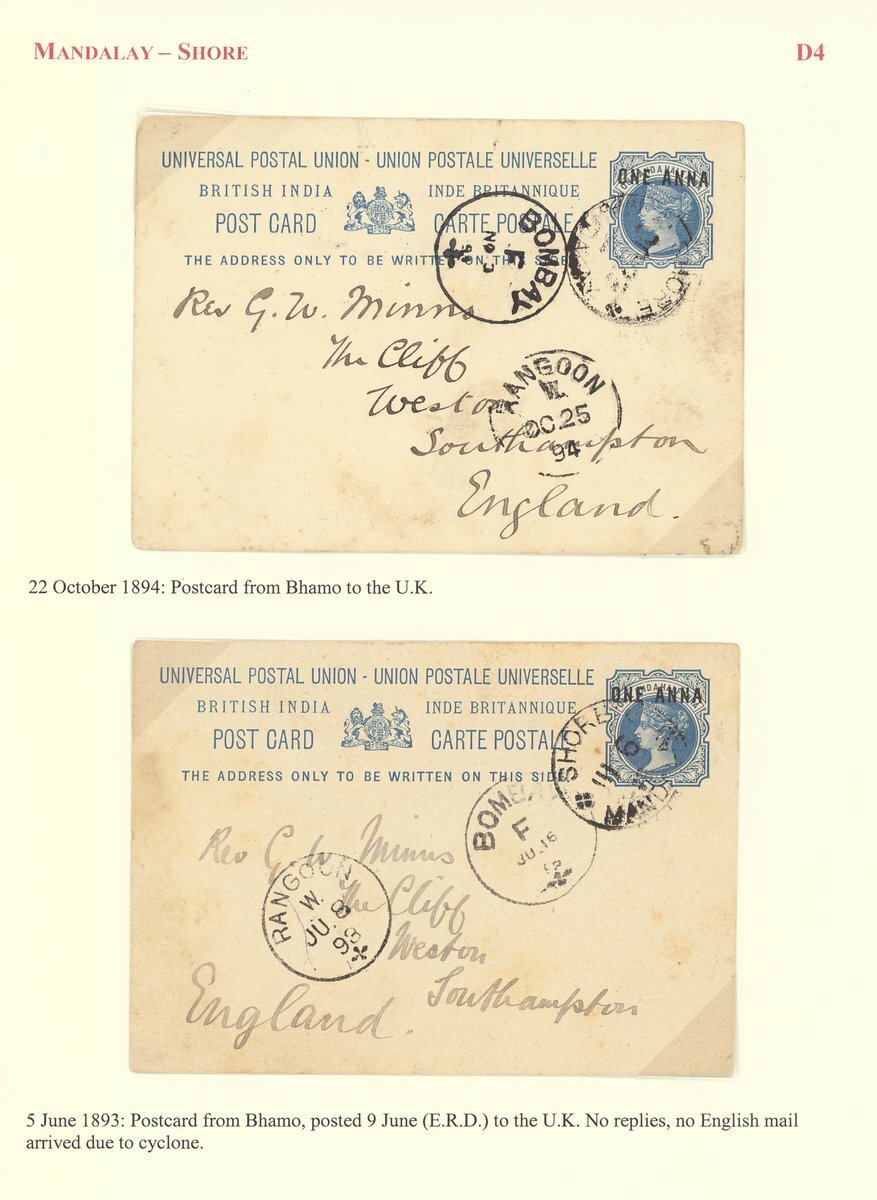 1893 (6 June) and 1894 (22 Oct.) 1a. on 1½a. stationery cards from Bhamo to Southampton, both cancelled by