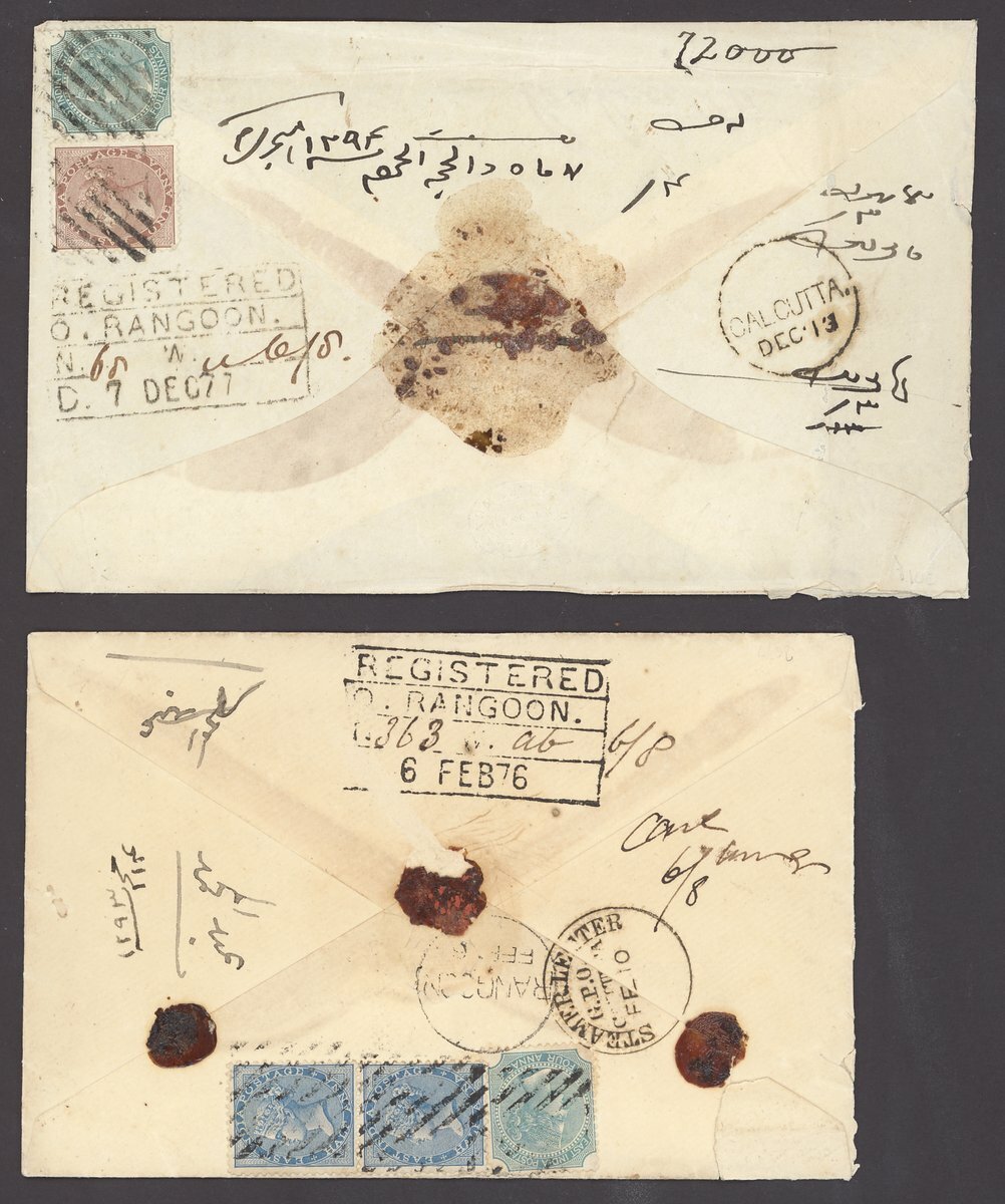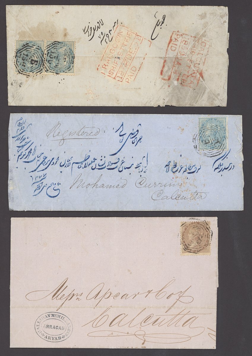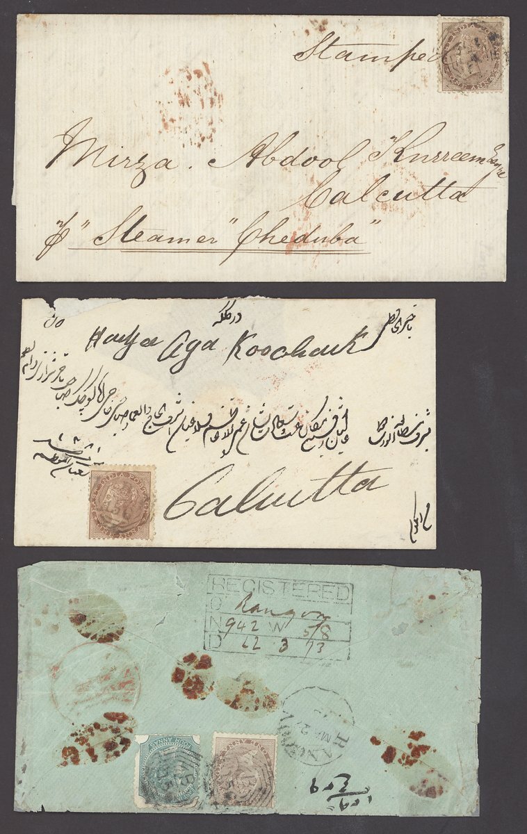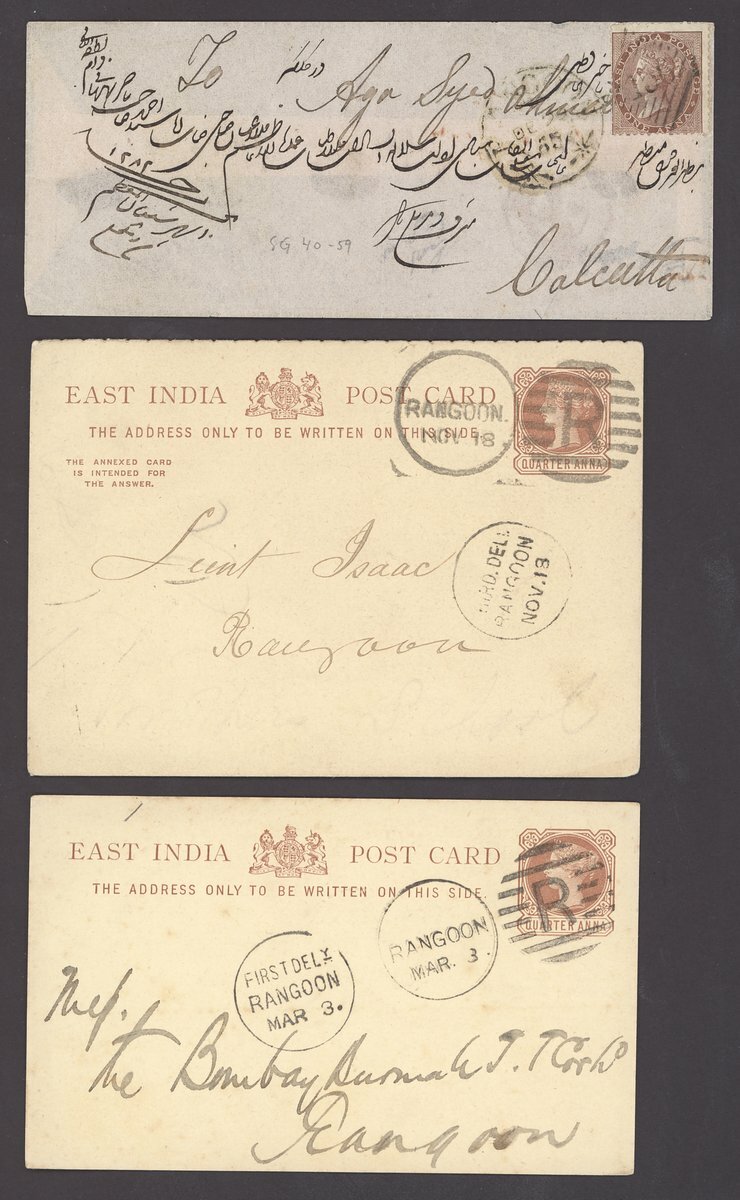 1858-85 entires (3) and envelopes (6, three registered) to Calcutta and ¼a. stationery cards (2) addressed locally, cancellations include "B/156" (6), "156" duplex, diamond of bars (2) and