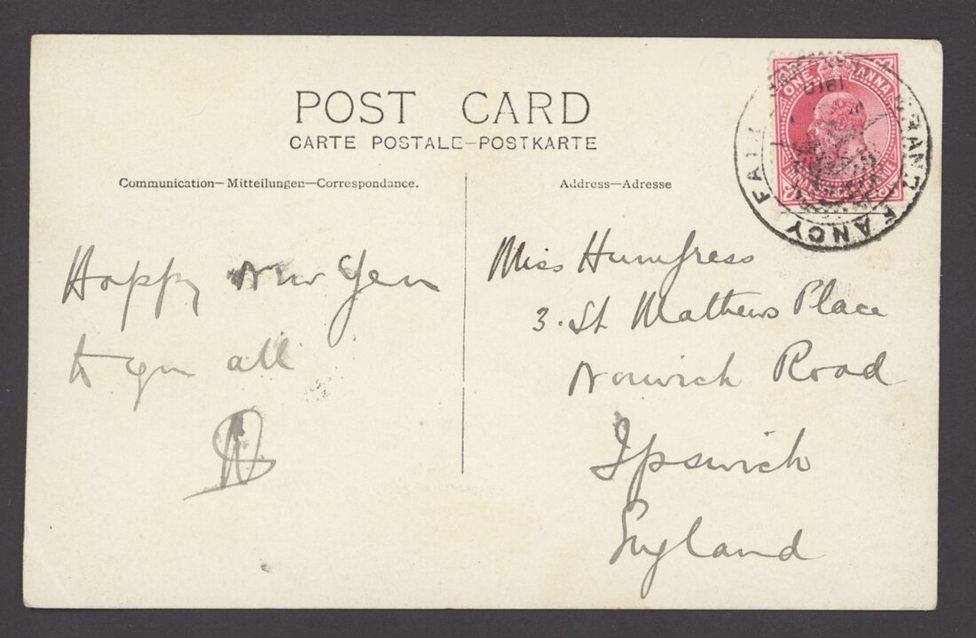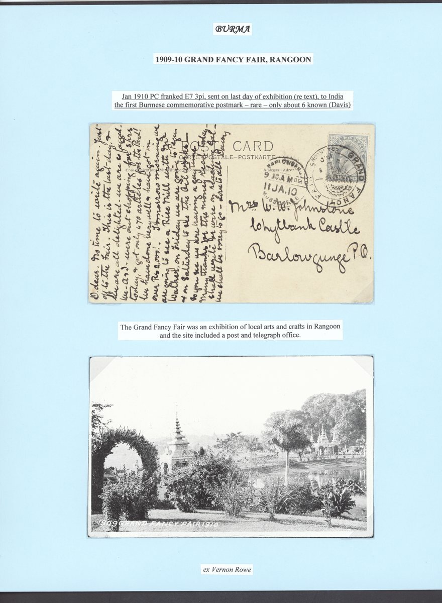 1910 photographic postcards ("1909 Grand Fancy Fair 1910") with different scenes to India and England, bearing 1902 3p. and 1a. respectively, tied by clear circular-framed