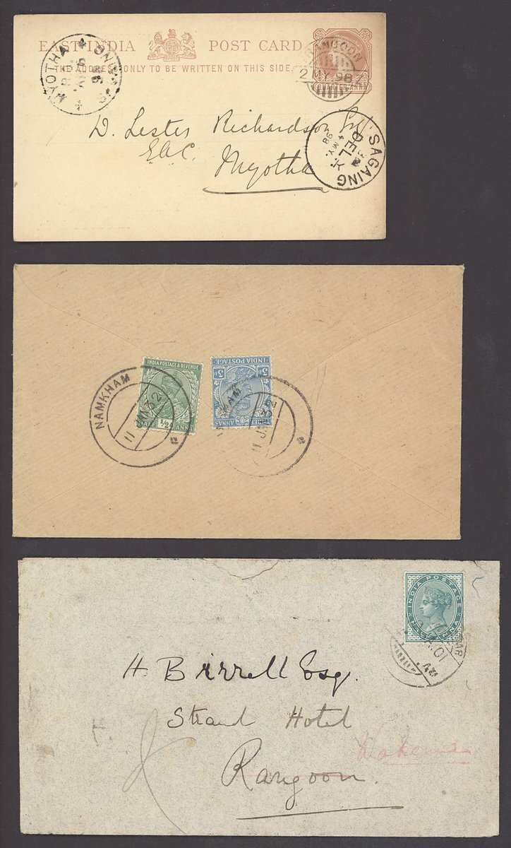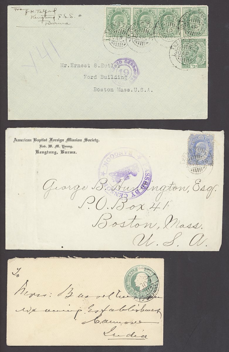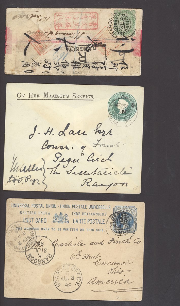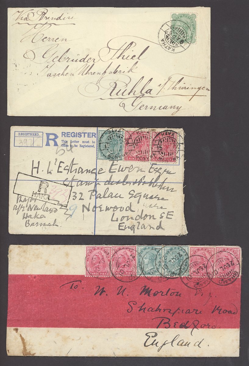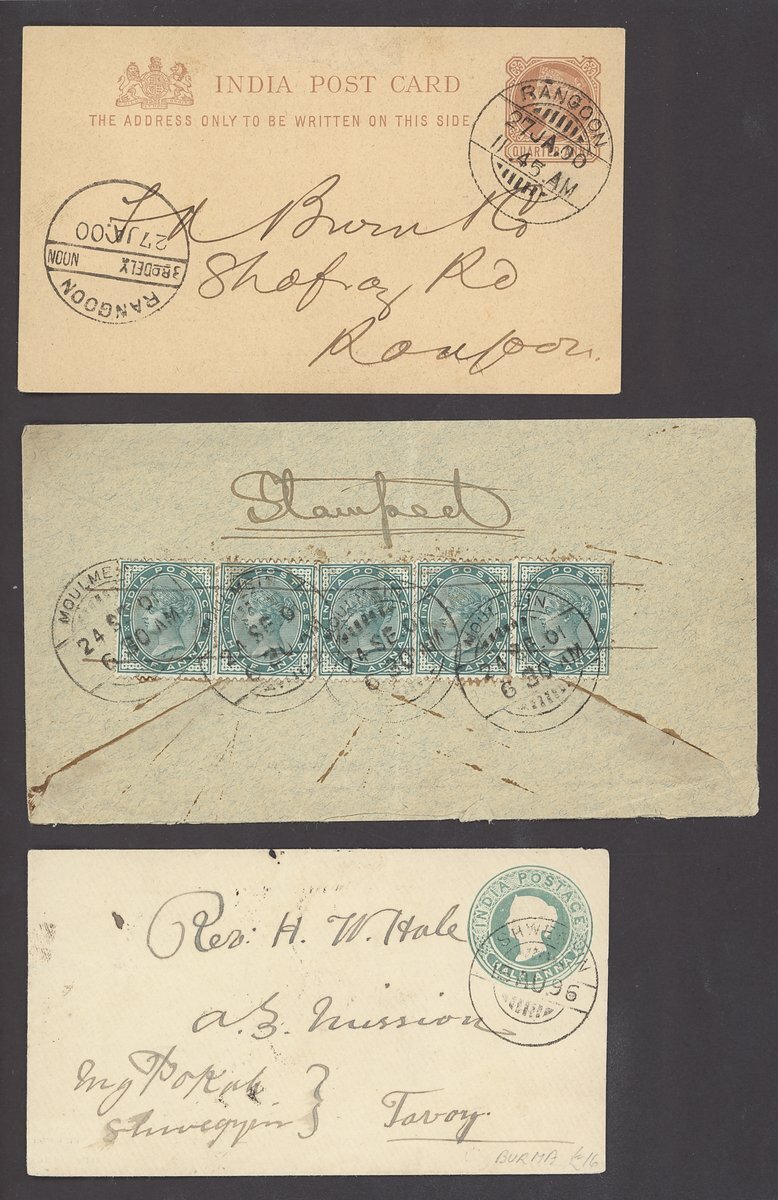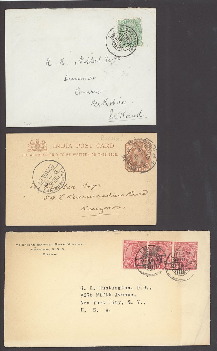 A range of envelopes (49, four registered; mostly stationery), stationery cards (19), registered envelopes (3) and wrappers (5), picture postcards (8) and a piece all cancelled by segmented datestamps, variously franked and addressed including to Belgium, France (2), Germany (2), Guatemala, Holland, Philippines and USA (5), cancellations include Bhamo (Type KD4, earlier than recorded)), Bhamo 2nd Dely (unrecorded), B.I. Barracks. Maymyo (KD1), Katha (KD2), Kengtung (KD2), Loikaw (KD2), Mupun (KD3), Mohnyin (KD3, later than recorded), Myingya Bazar (registered, Type D3 with provisional registration label), Papun (registered; Type KD4, earliest recorded date andR2, only recorded date), Pazundaung (Type KD4), Pyu Toungoo (Type KD2), Rangoon Ahlone (Type KD2), Rangoon Boundary Road 2nd Dely (unrecorded), Rangoon Suratee Bazaar (Type KD1, Taunggyi (Type KD1, earlier than recorded), Thaton (Type KD3), Thongwa (registered; Type KD2) and Yenangyat (Type KD1). A good lot well worth viewing