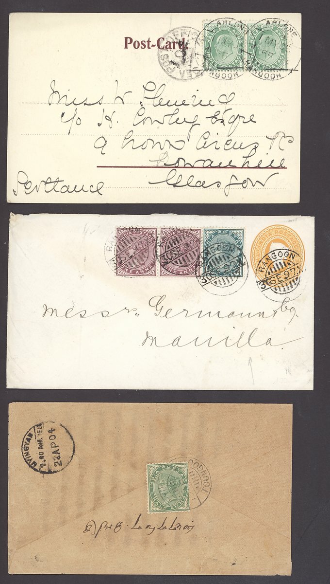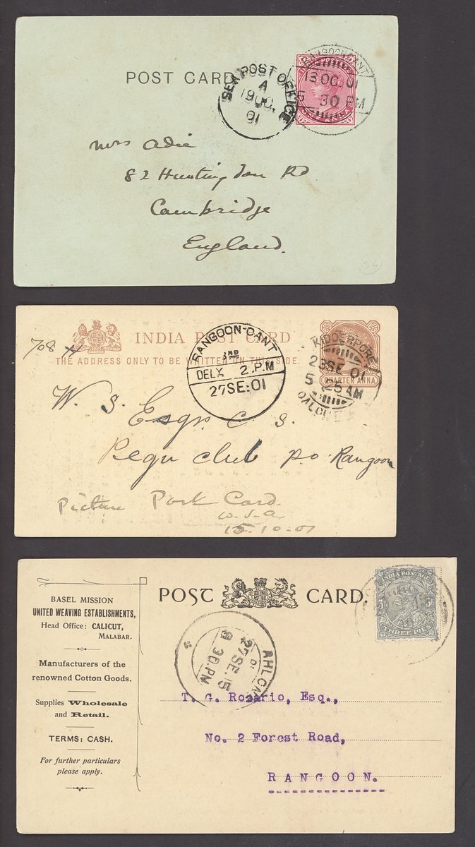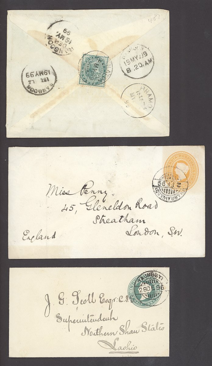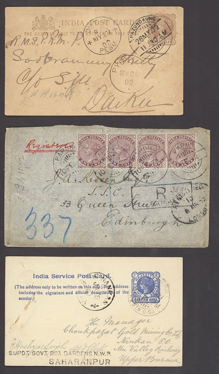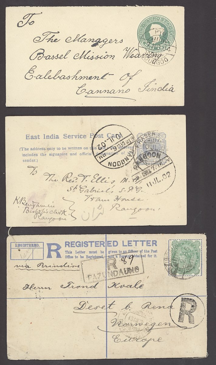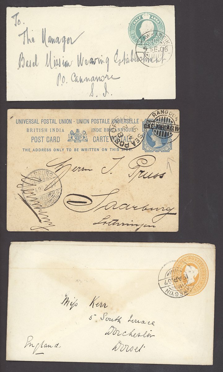A range of envelopes (49, four registered; mostly stationery), stationery cards (19), registered envelopes (3) and wrappers (5), picture postcards (8) and a piece all cancelled by segmented datestamps, variously franked and addressed including to Belgium, France (2), Germany (2), Guatemala, Holland, Philippines and USA (5), cancellations include Bhamo (Type KD4, earlier than recorded)), Bhamo 2nd Dely (unrecorded), B.I. Barracks. Maymyo (KD1), Katha (KD2), Kengtung (KD2), Loikaw (KD2), Mupun (KD3), Mohnyin (KD3, later than recorded), Myingya Bazar (registered, Type D3 with provisional registration label), Papun (registered; Type KD4, earliest recorded date andR2, only recorded date), Pazundaung (Type KD4), Pyu Toungoo (Type KD2), Rangoon Ahlone (Type KD2), Rangoon Boundary Road 2nd Dely (unrecorded), Rangoon Suratee Bazaar (Type KD1, Taunggyi (Type KD1, earlier than recorded), Thaton (Type KD3), Thongwa (registered; Type KD2) and Yenangyat (Type KD1). A good lot well worth viewing