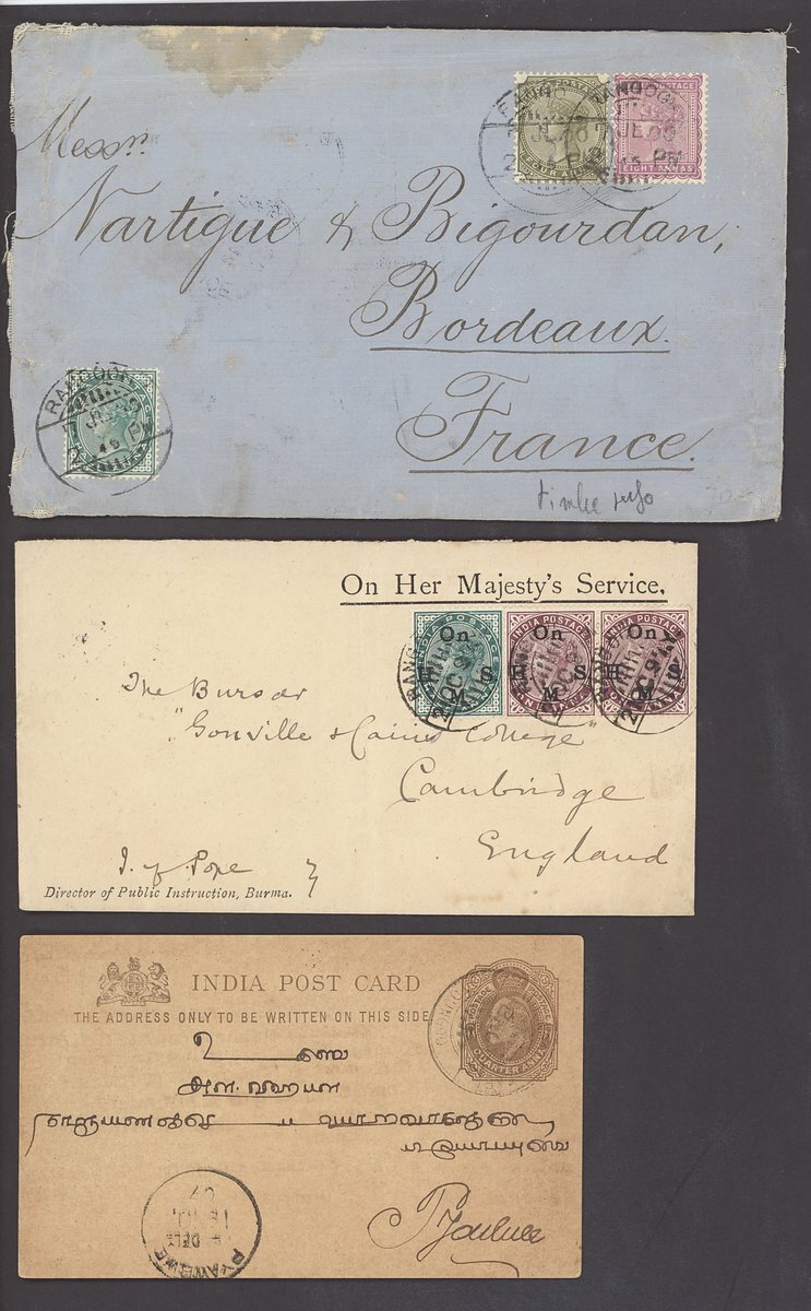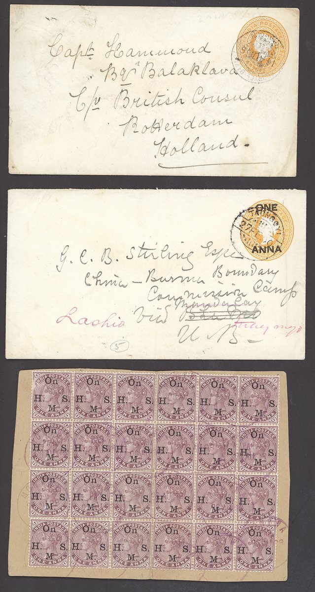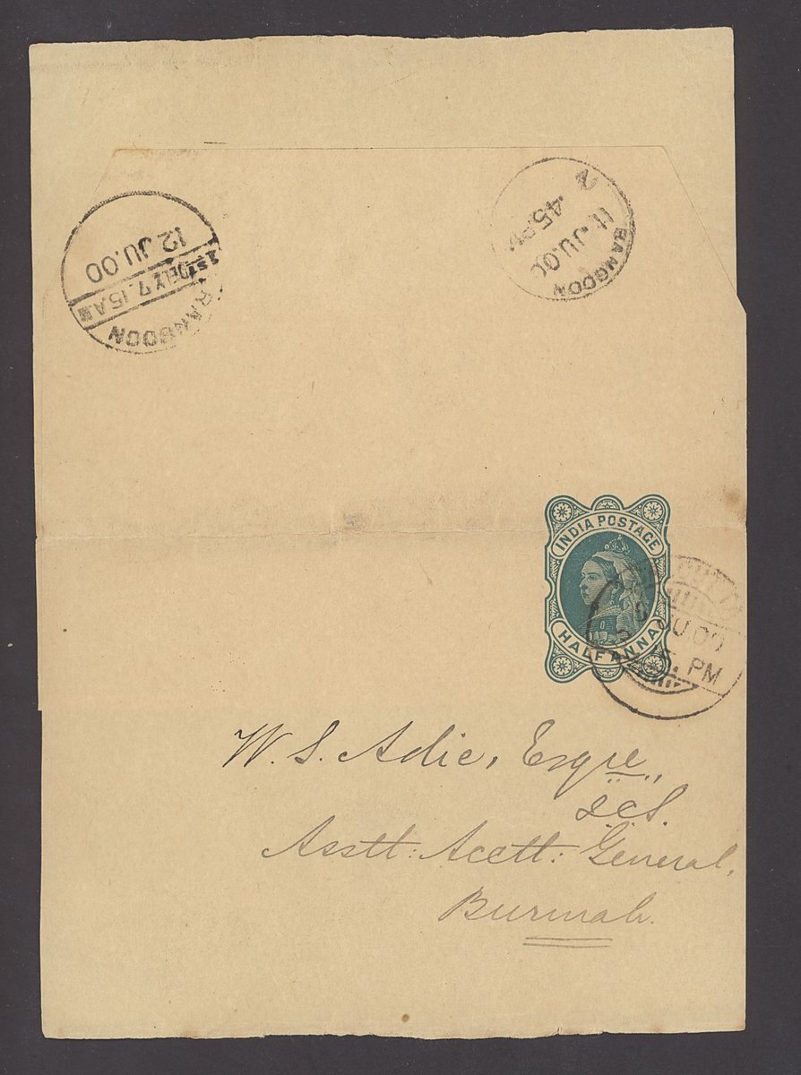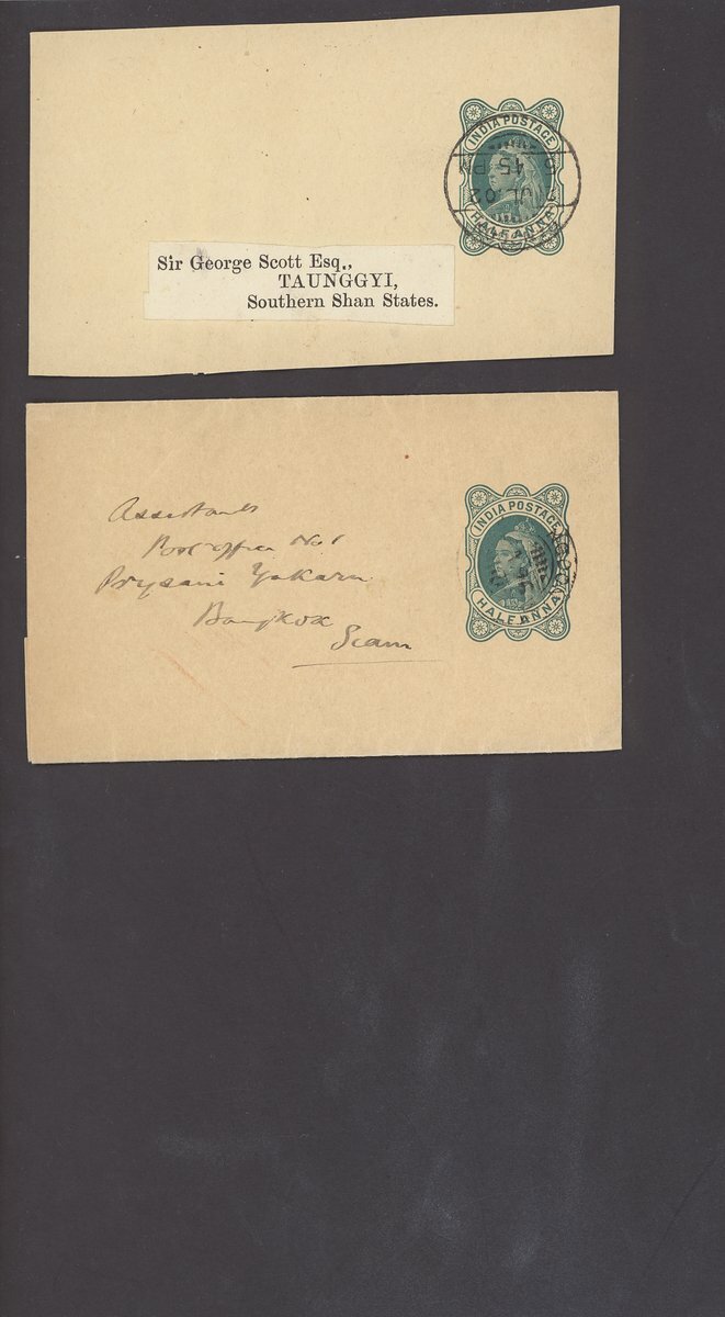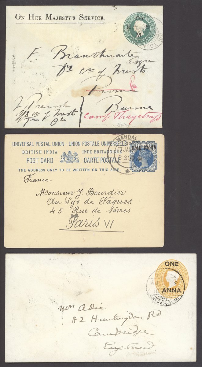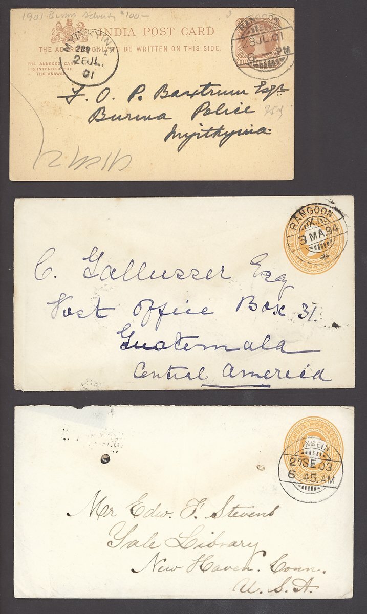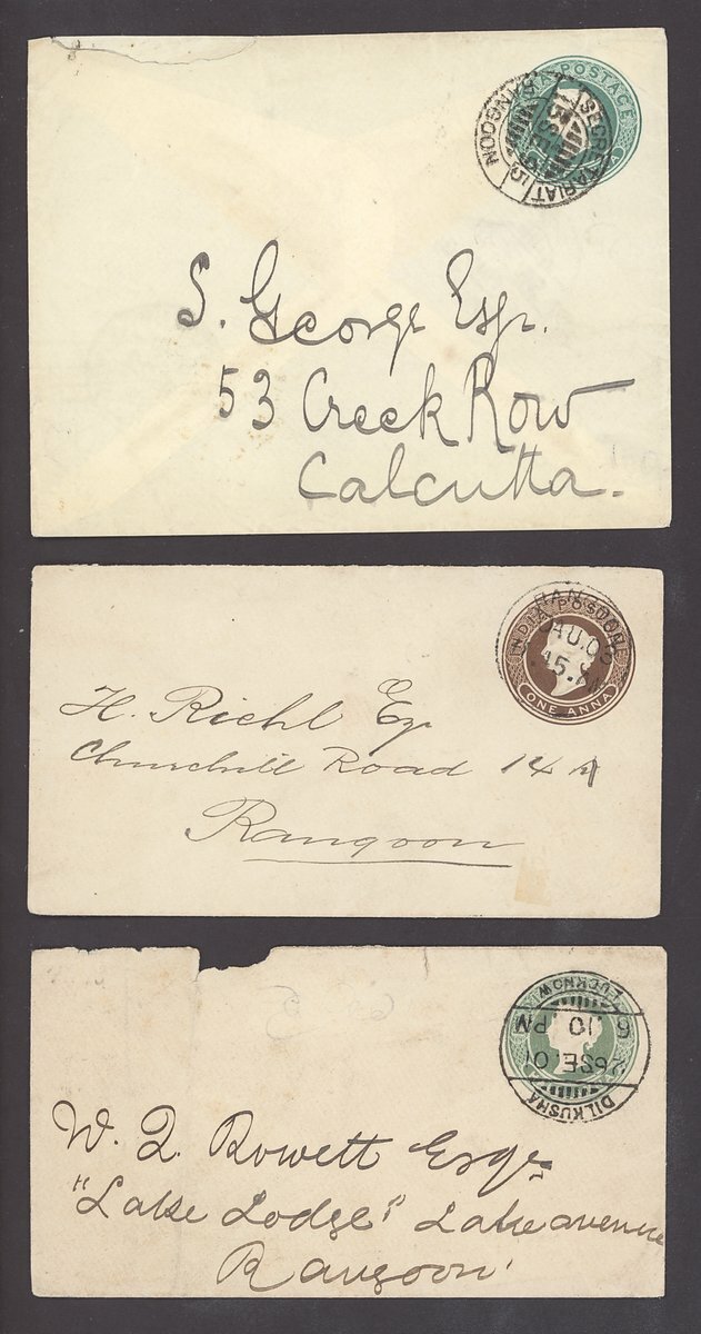 A range of envelopes (49, four registered; mostly stationery), stationery cards (19), registered envelopes (3) and wrappers (5), picture postcards (8) and a piece all cancelled by segmented datestamps, variously franked and addressed including to Belgium, France (2), Germany (2), Guatemala, Holland, Philippines and USA (5), cancellations include Bhamo (Type KD4, earlier than recorded)), Bhamo 2nd Dely (unrecorded), B.I. Barracks. Maymyo (KD1), Katha (KD2), Kengtung (KD2), Loikaw (KD2), Mupun (KD3), Mohnyin (KD3, later than recorded), Myingya Bazar (registered, Type D3 with provisional registration label), Papun (registered; Type KD4, earliest recorded date andR2, only recorded date), Pazundaung (Type KD4), Pyu Toungoo (Type KD2), Rangoon Ahlone (Type KD2), Rangoon Boundary Road 2nd Dely (unrecorded), Rangoon Suratee Bazaar (Type KD1, Taunggyi (Type KD1, earlier than recorded), Thaton (Type KD3), Thongwa (registered; Type KD2) and Yenangyat (Type KD1). A good lot well worth viewing