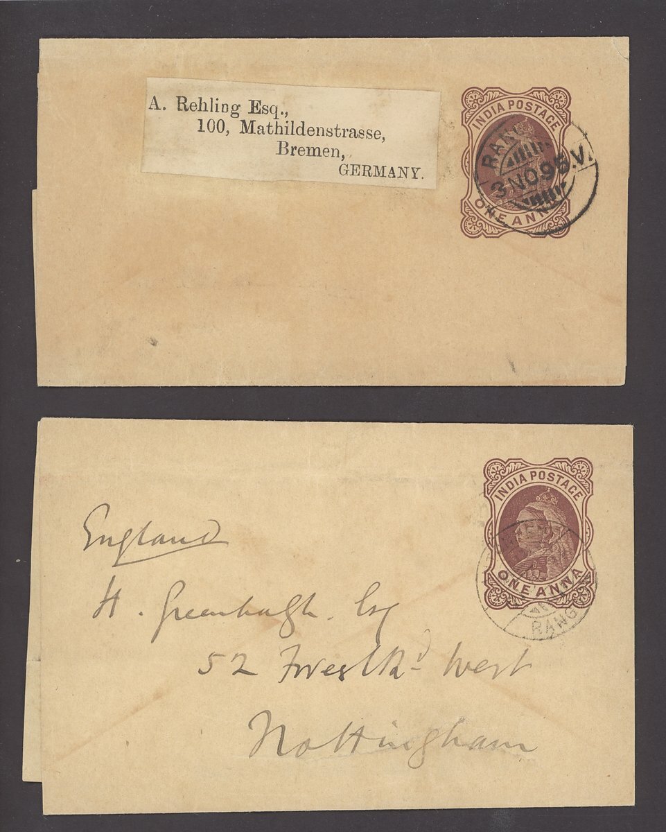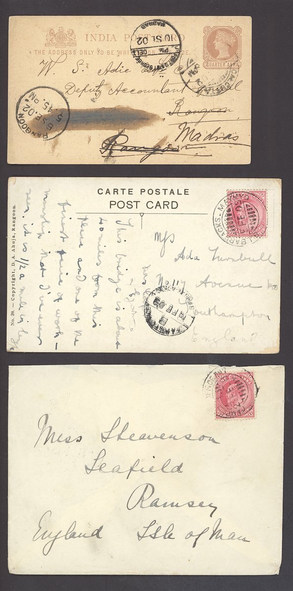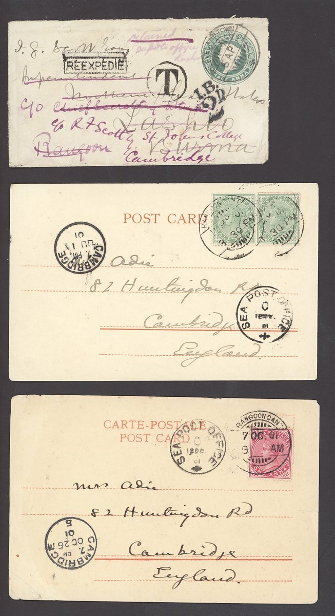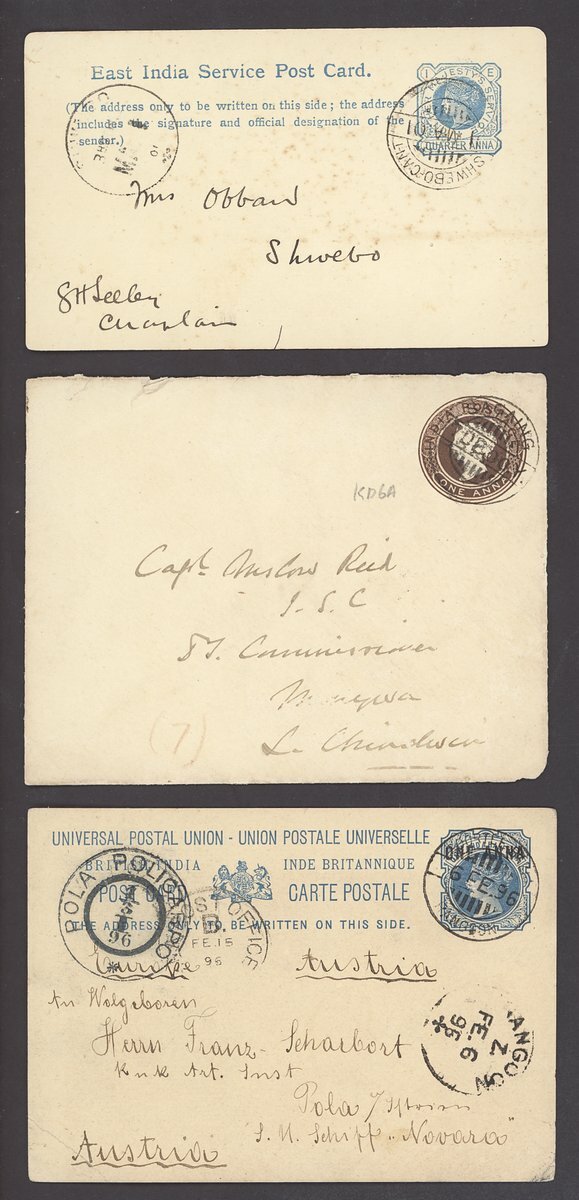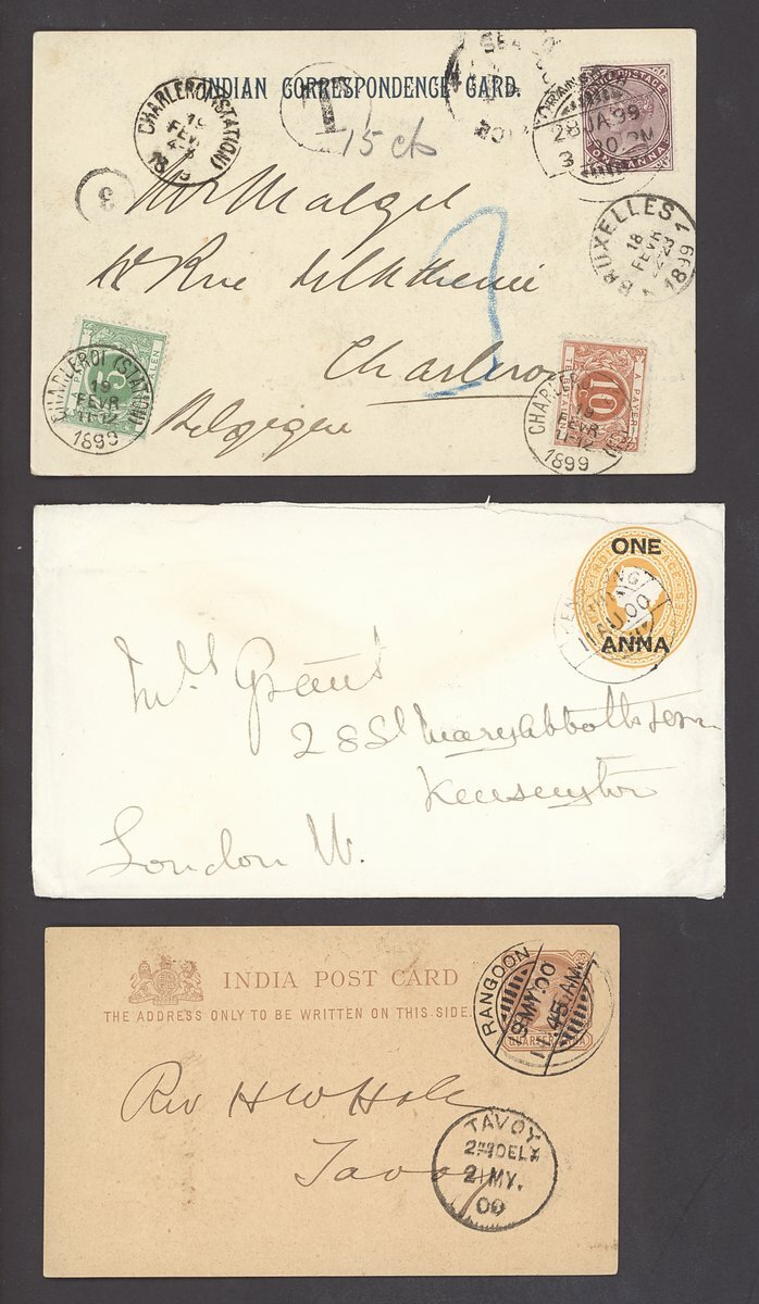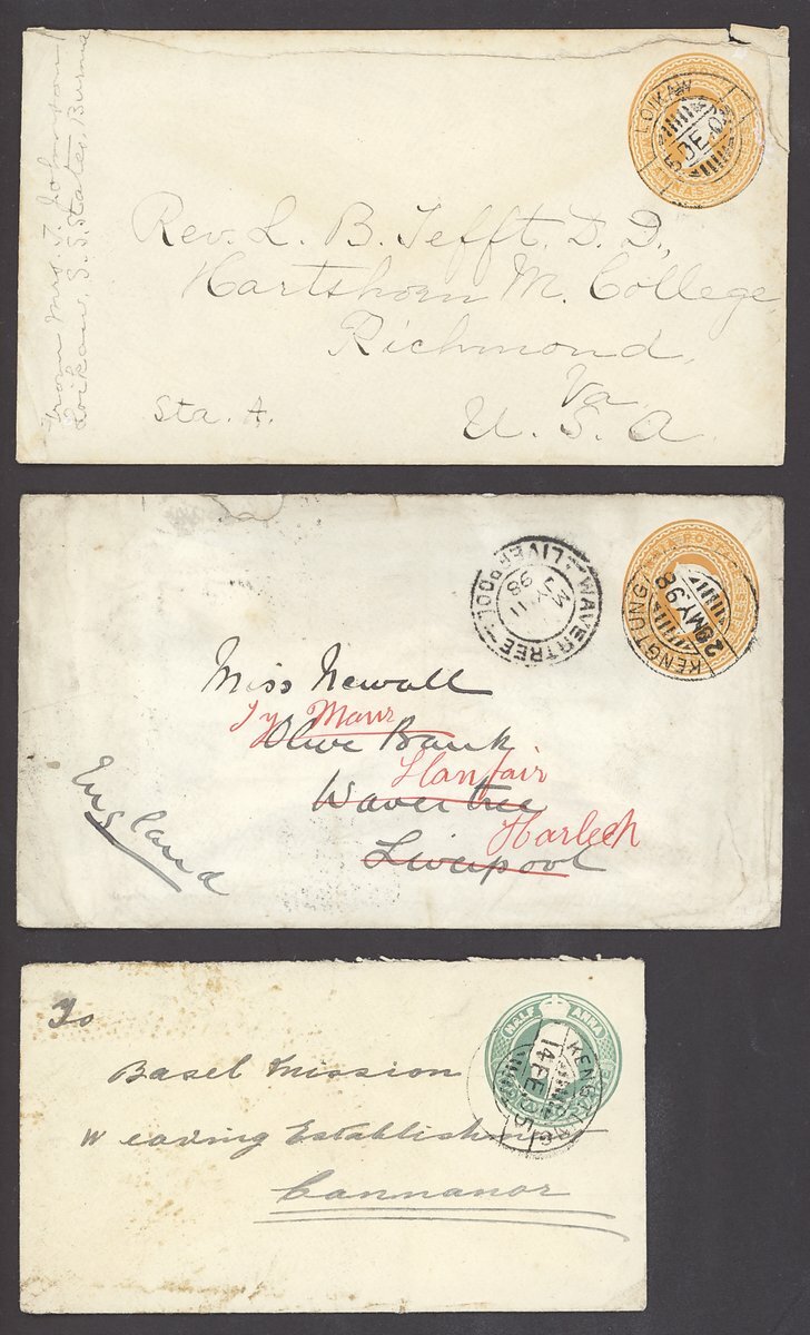 A range of envelopes (49, four registered; mostly stationery), stationery cards (19), registered envelopes (3) and wrappers (5), picture postcards (8) and a piece all cancelled by segmented datestamps, variously franked and addressed including to Belgium, France (2), Germany (2), Guatemala, Holland, Philippines and USA (5), cancellations include Bhamo (Type KD4, earlier than recorded)), Bhamo 2nd Dely (unrecorded), B.I. Barracks. Maymyo (KD1), Katha (KD2), Kengtung (KD2), Loikaw (KD2), Mupun (KD3), Mohnyin (KD3, later than recorded), Myingya Bazar (registered, Type D3 with provisional registration label), Papun (registered; Type KD4, earliest recorded date andR2, only recorded date), Pazundaung (Type KD4), Pyu Toungoo (Type KD2), Rangoon Ahlone (Type KD2), Rangoon Boundary Road 2nd Dely (unrecorded), Rangoon Suratee Bazaar (Type KD1, Taunggyi (Type KD1, earlier than recorded), Thaton (Type KD3), Thongwa (registered; Type KD2) and Yenangyat (Type KD1). A good lot well worth viewing