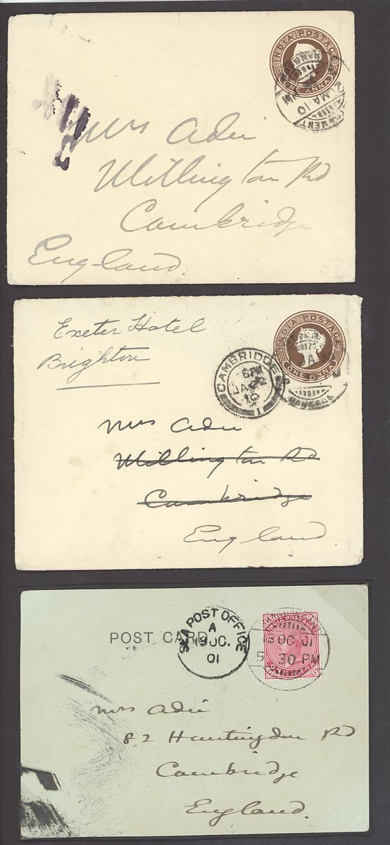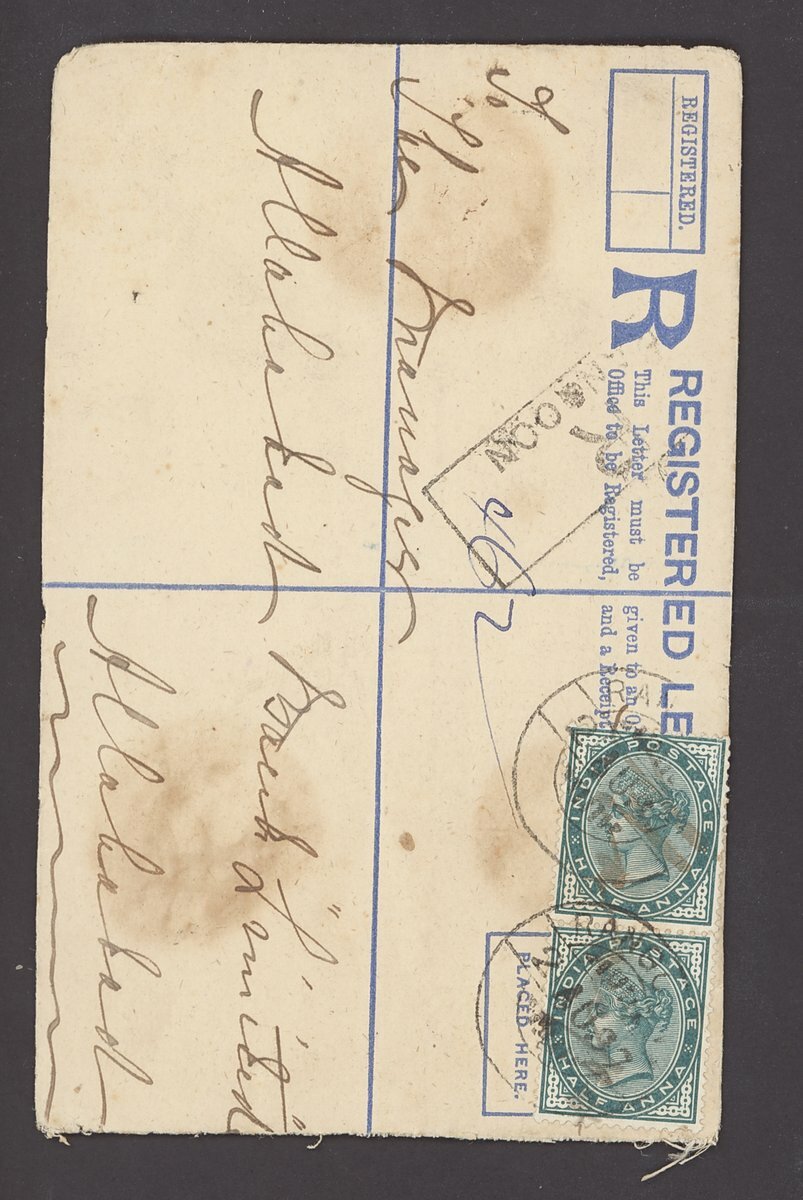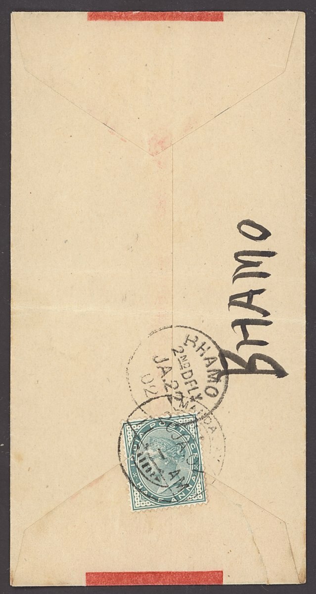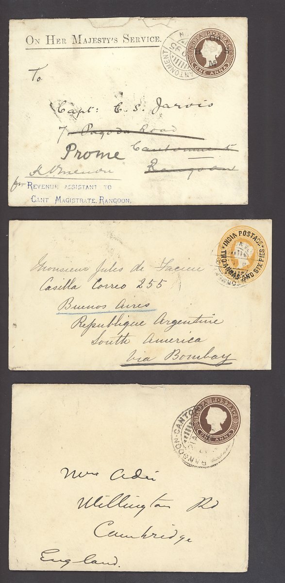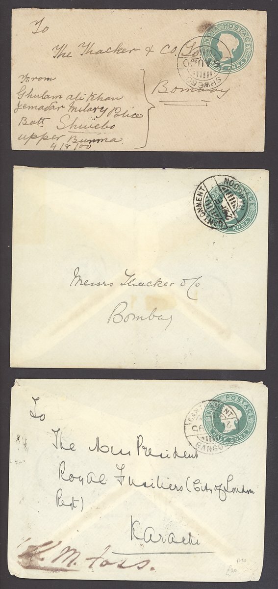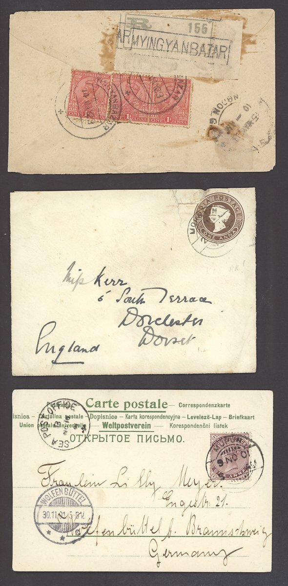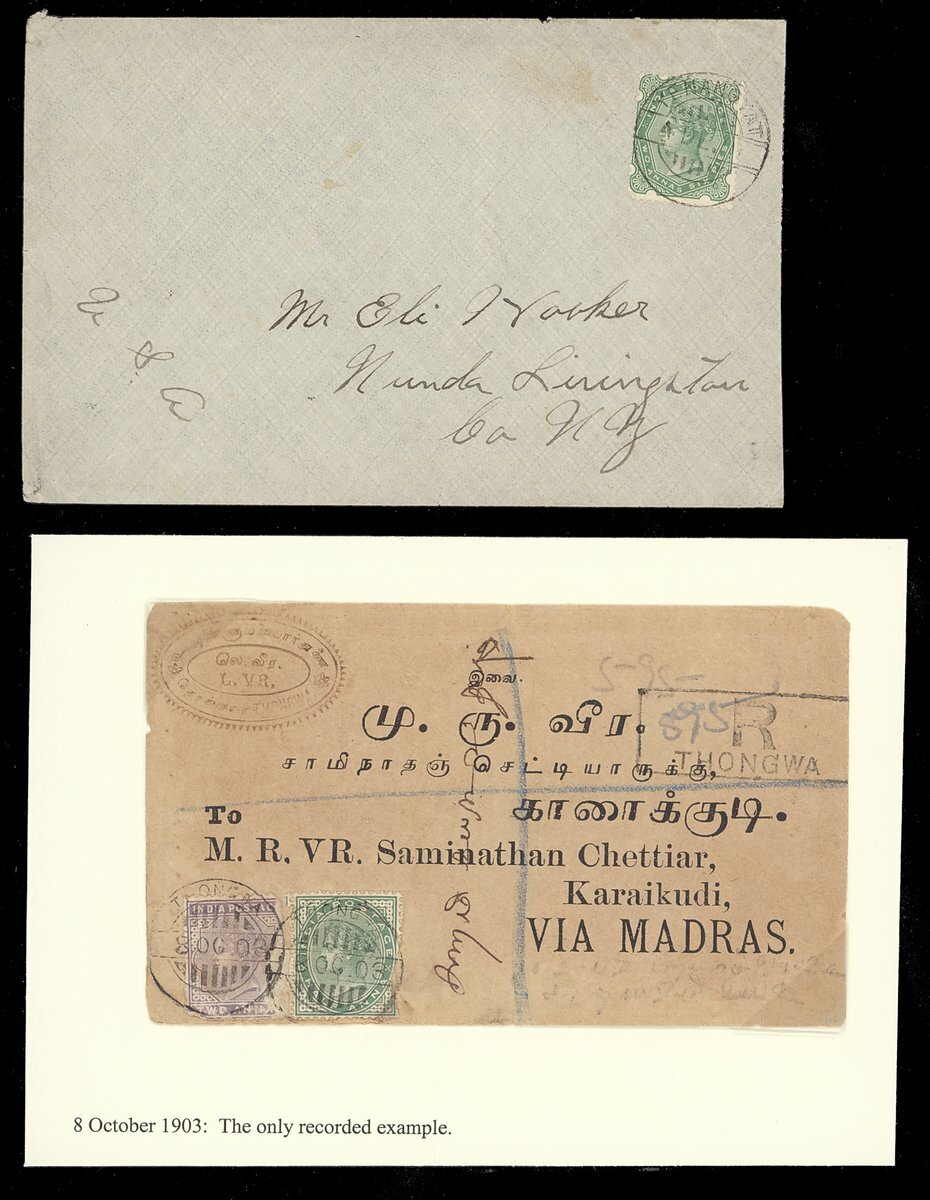 A range of envelopes (49, four registered; mostly stationery), stationery cards (19), registered envelopes (3) and wrappers (5), picture postcards (8) and a piece all cancelled by segmented datestamps, variously franked and addressed including to Belgium, France (2), Germany (2), Guatemala, Holland, Philippines and USA (5), cancellations include Bhamo (Type KD4, earlier than recorded)), Bhamo 2nd Dely (unrecorded), B.I. Barracks. Maymyo (KD1), Katha (KD2), Kengtung (KD2), Loikaw (KD2), Mupun (KD3), Mohnyin (KD3, later than recorded), Myingya Bazar (registered, Type D3 with provisional registration label), Papun (registered; Type KD4, earliest recorded date andR2, only recorded date), Pazundaung (Type KD4), Pyu Toungoo (Type KD2), Rangoon Ahlone (Type KD2), Rangoon Boundary Road 2nd Dely (unrecorded), Rangoon Suratee Bazaar (Type KD1, Taunggyi (Type KD1, earlier than recorded), Thaton (Type KD3), Thongwa (registered; Type KD2) and Yenangyat (Type KD1). A good lot well worth viewing