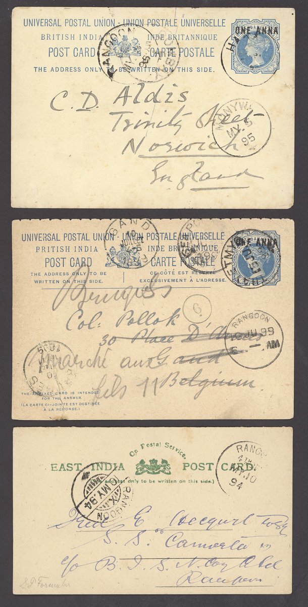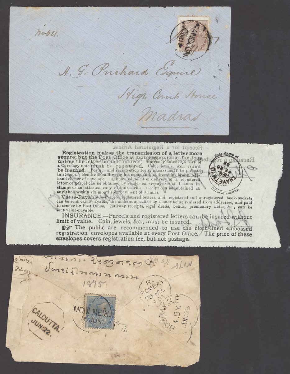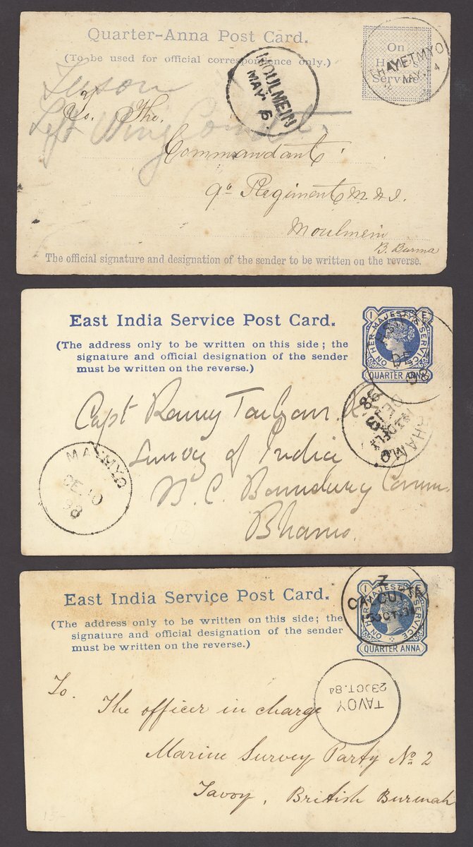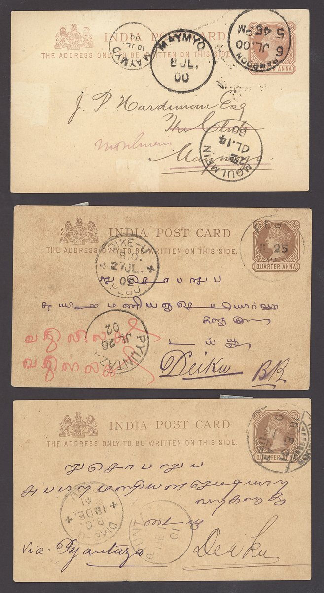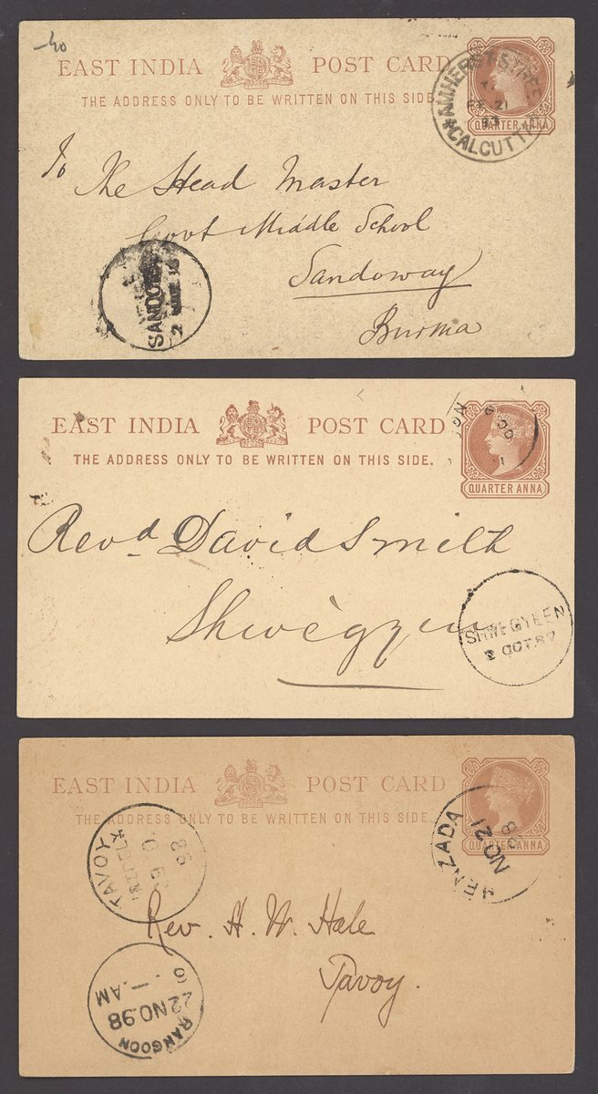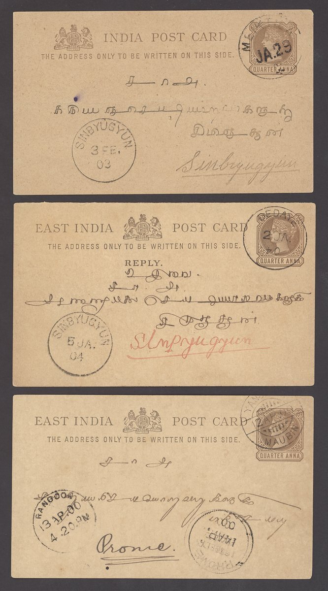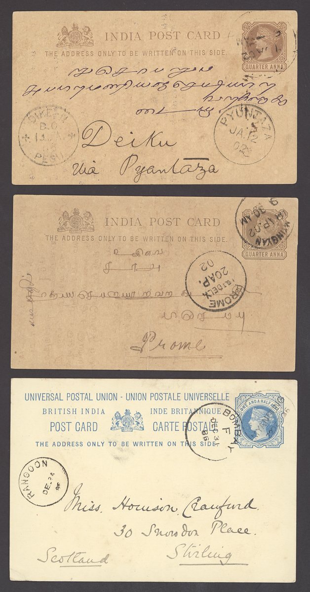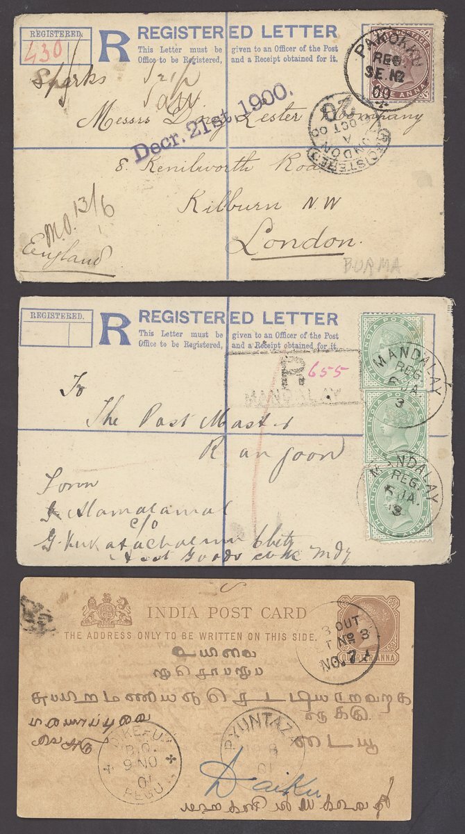 1881-1903 covers (3), ¼a. (15), 1½a. (5), 1a. on 1½a. (12) and Official (5) stationery cards and 2a. registered envelopes (2), variously addressed and all cancelled by or with transit/arrival single-ring d.s. including those of Dike-U Pegu, Haka, Maiktila, Padoung, Pyuntaza, Shwenyaungbin Mogok, Sinbyugyun, Sitkaw, Tharrawaddy, Thonze Therrawaddy, Tigyaing and Yenangyaung. A good lot well worth examination