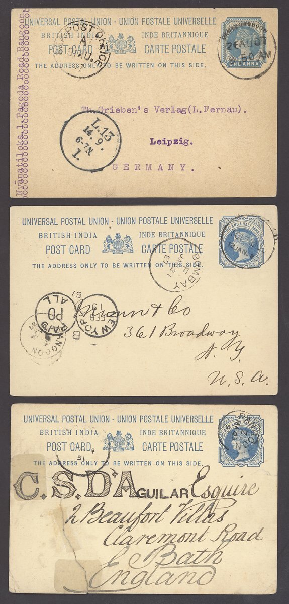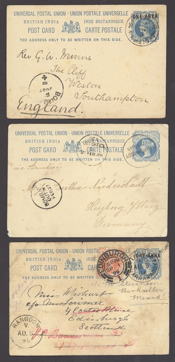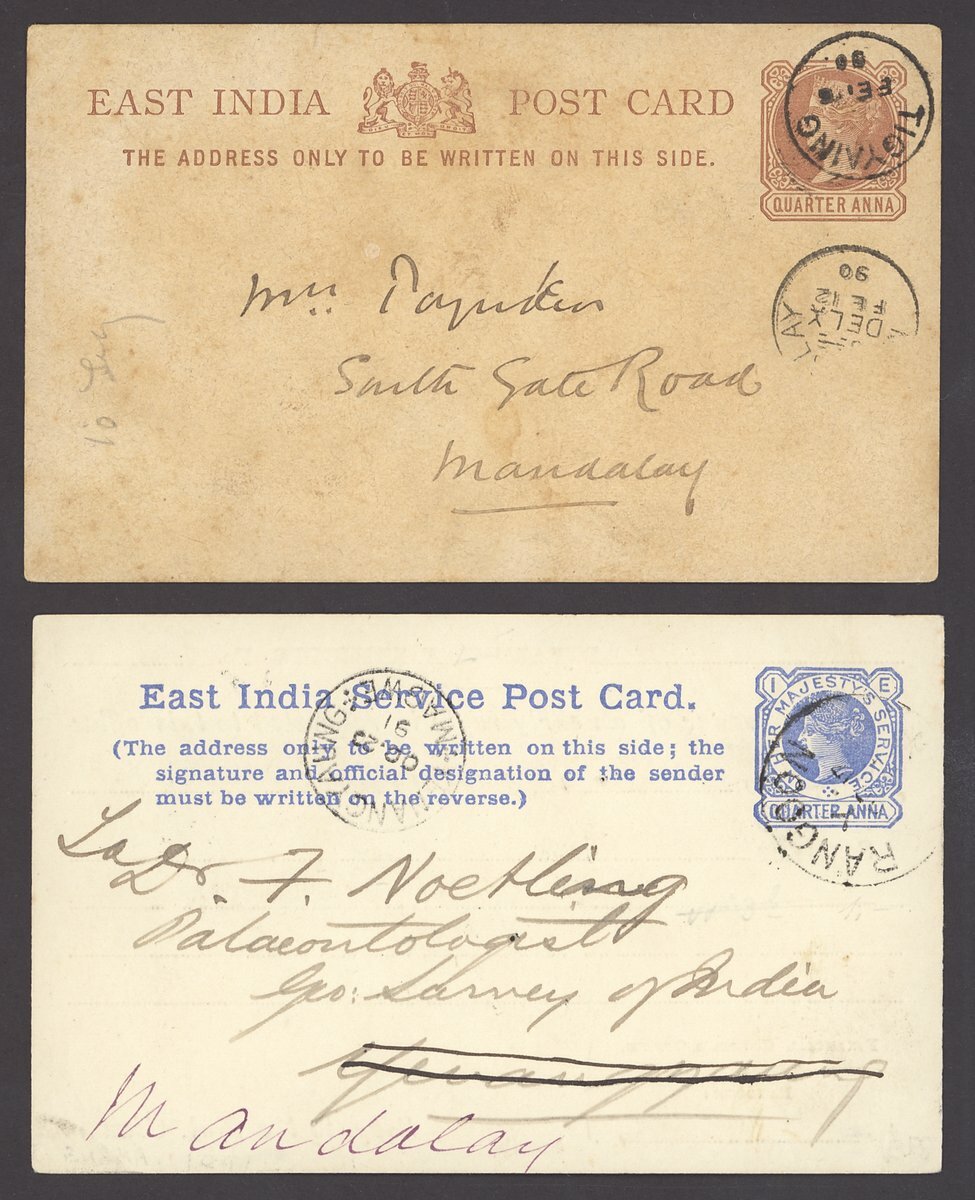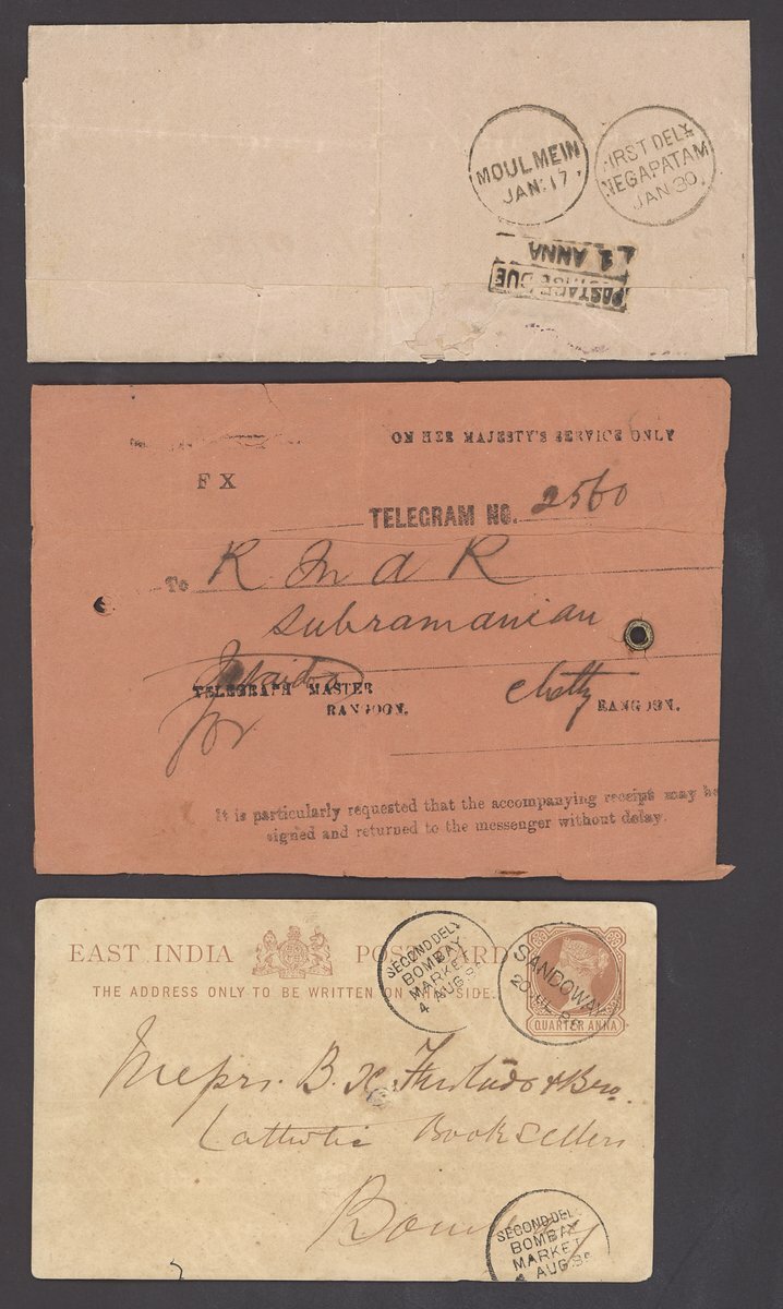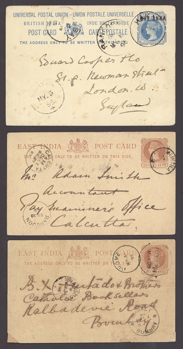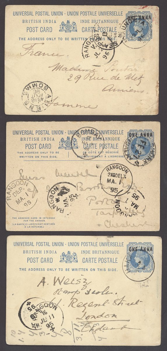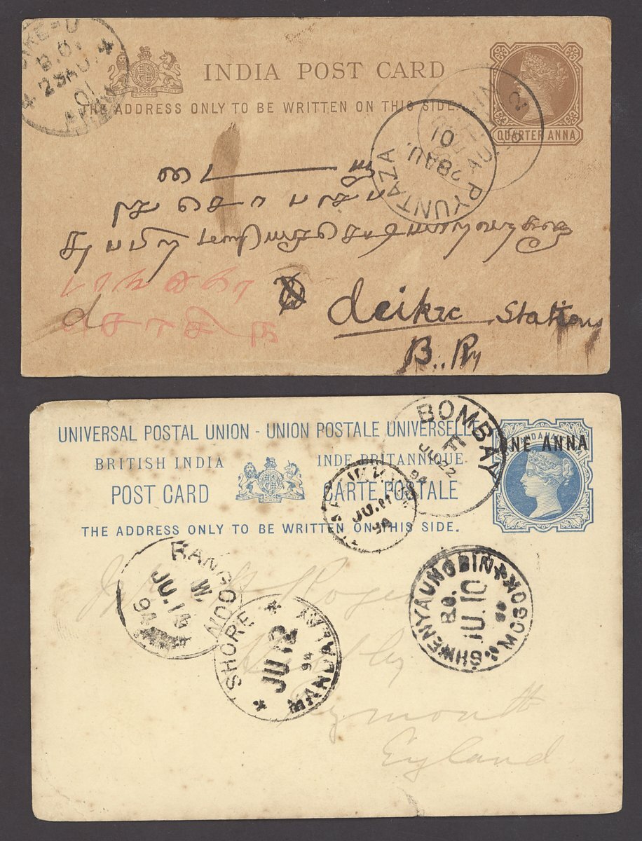 1881-1903 covers (3), ¼a. (15), 1½a. (5), 1a. on 1½a. (12) and Official (5) stationery cards and 2a. registered envelopes (2), variously addressed and all cancelled by or with transit/arrival single-ring d.s. including those of Dike-U Pegu, Haka, Maiktila, Padoung, Pyuntaza, Shwenyaungbin Mogok, Sinbyugyun, Sitkaw, Tharrawaddy, Thonze Therrawaddy, Tigyaing and Yenangyaung. A good lot well worth examination