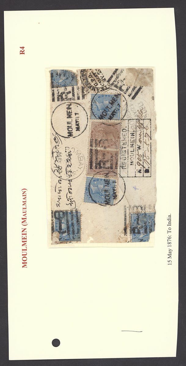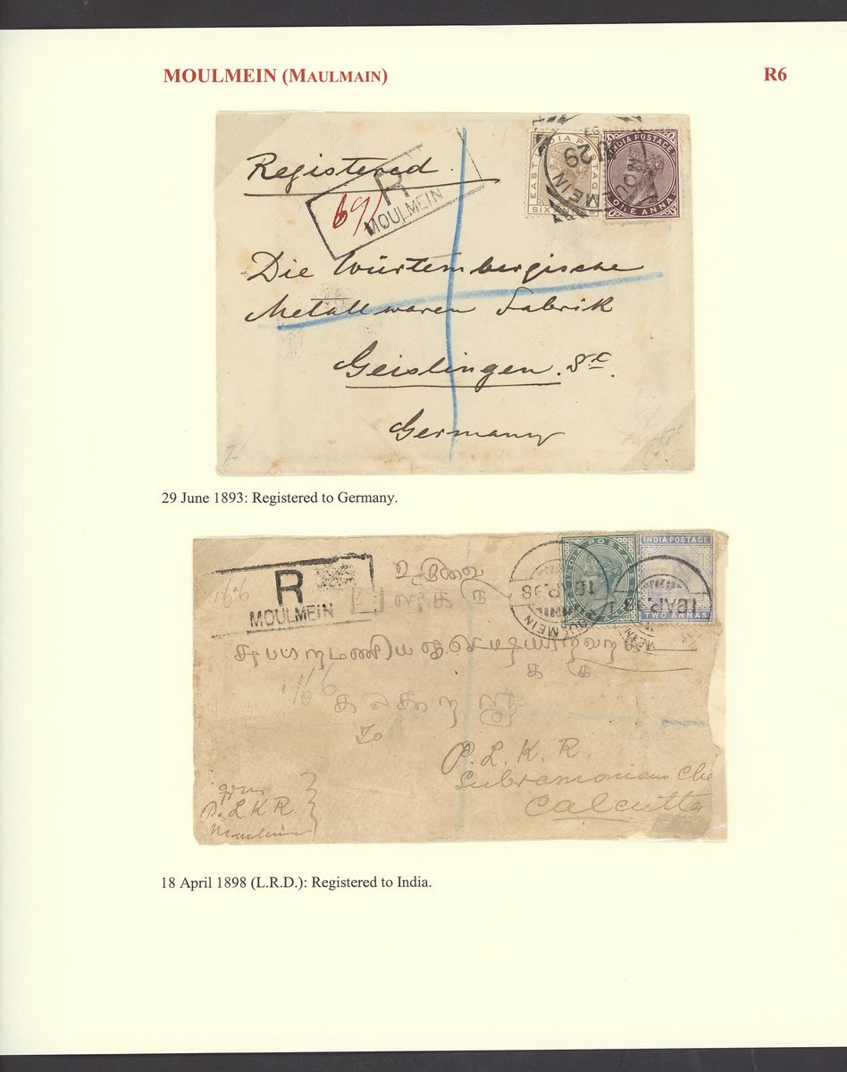 1876 (15 May) back of envelope registered to India, bearing ½a. (5, three damaged) and 1a. pair (two other stamps missing) tied by "R-8" duplex and showing Type R4 registration d.s.; 1893 (29 June) envelope registered to Germany bearing 1a. and 6a. tied by