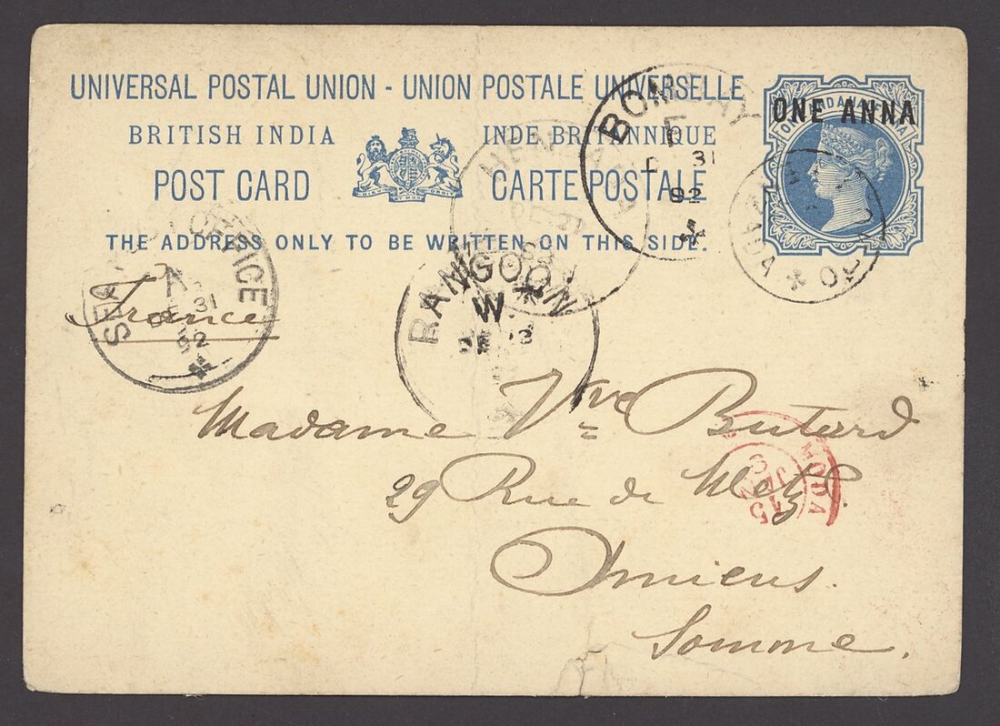 1892 (21 Dec.) 1a. on 1½a. stationery card to France cancelled by