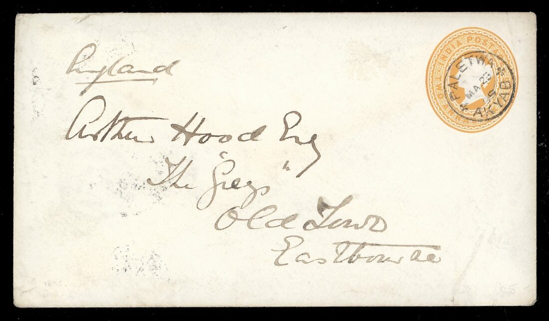 1895 (23 Mar.) 2½a. stationery envelope to Eastbourne, clearly cancelled by fine