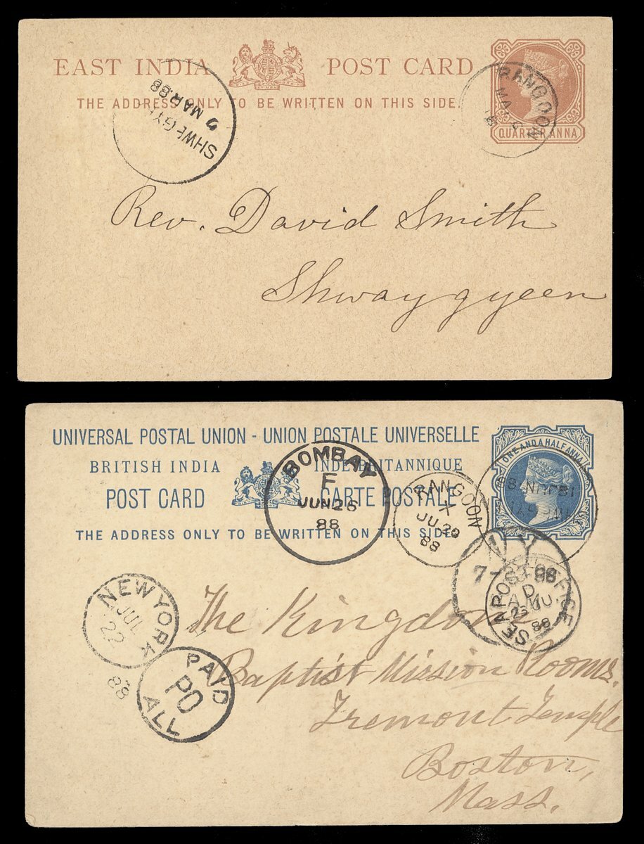 1888 (6 Mar.) ¼a. stationery card from Rangoon to Shwegyin showing Type D5 arrival c.d.s. at upper left; and 1888 (18 June) 1½a. stationery card to USA, cancelled by