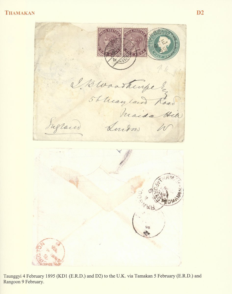1895 (4 Feb.) ½a. stationery envelope from Taunggyi to London uprated with 1a. pair, the stamp impression cancelled by Type KD1 (earliest recorded date) and the 1a. pair cancelled by Type D2, the reverse showing very scarce