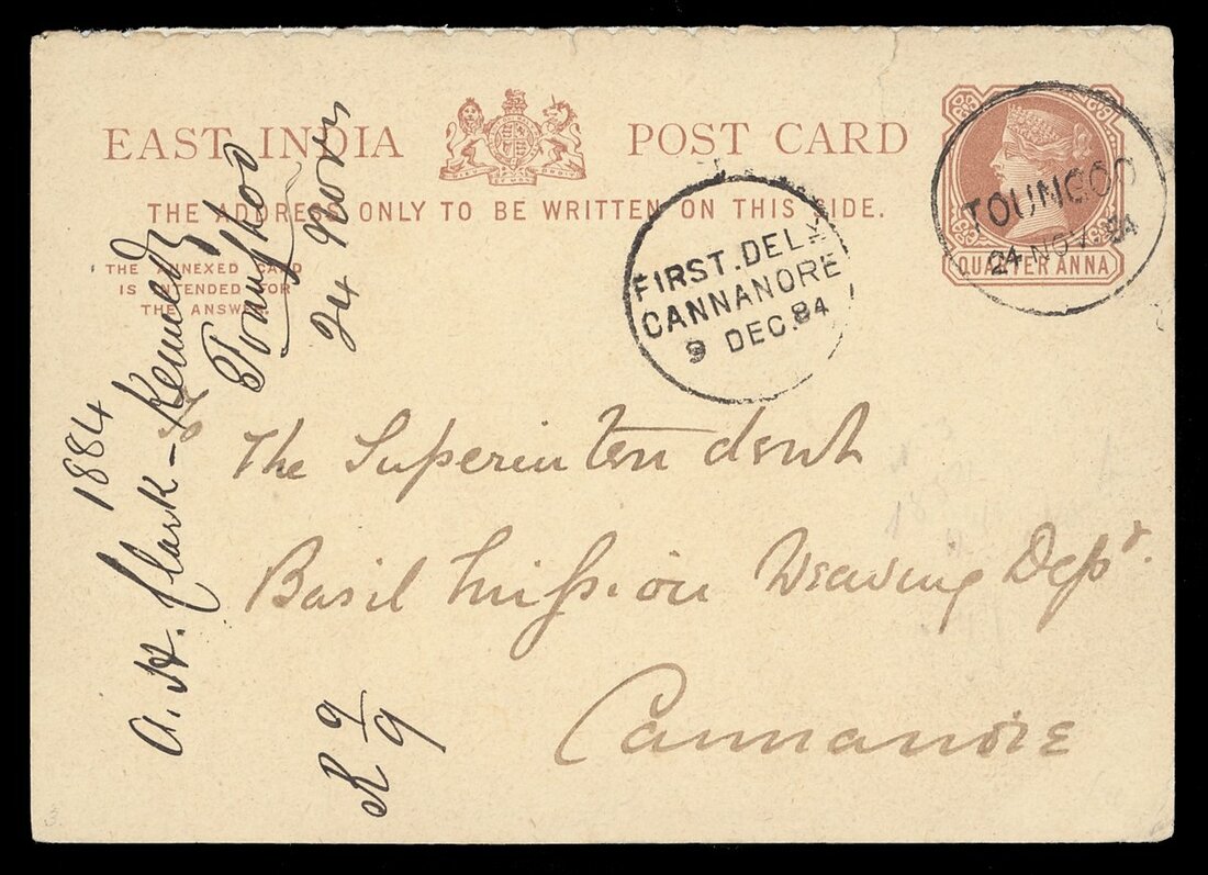 1884 (24 Nov.) outward half of ¼a. reply paid card (small tear at top) to Cannanore, cancelled by