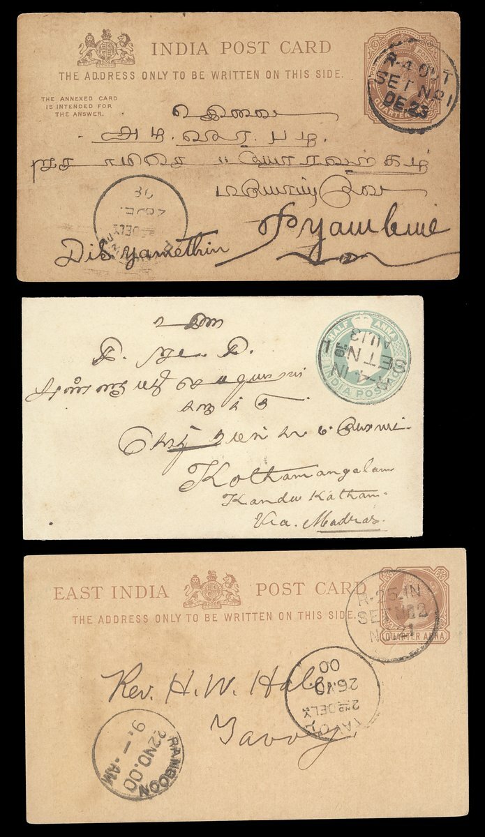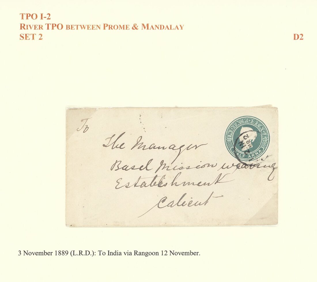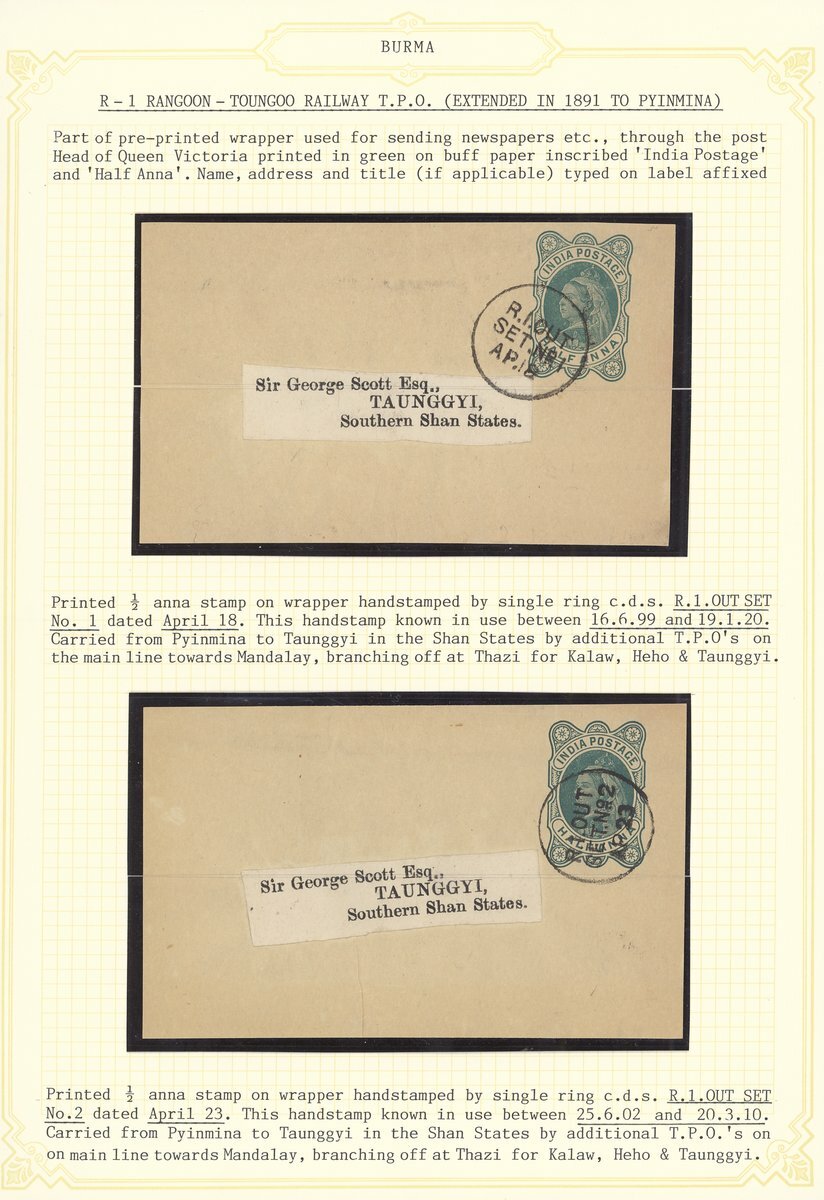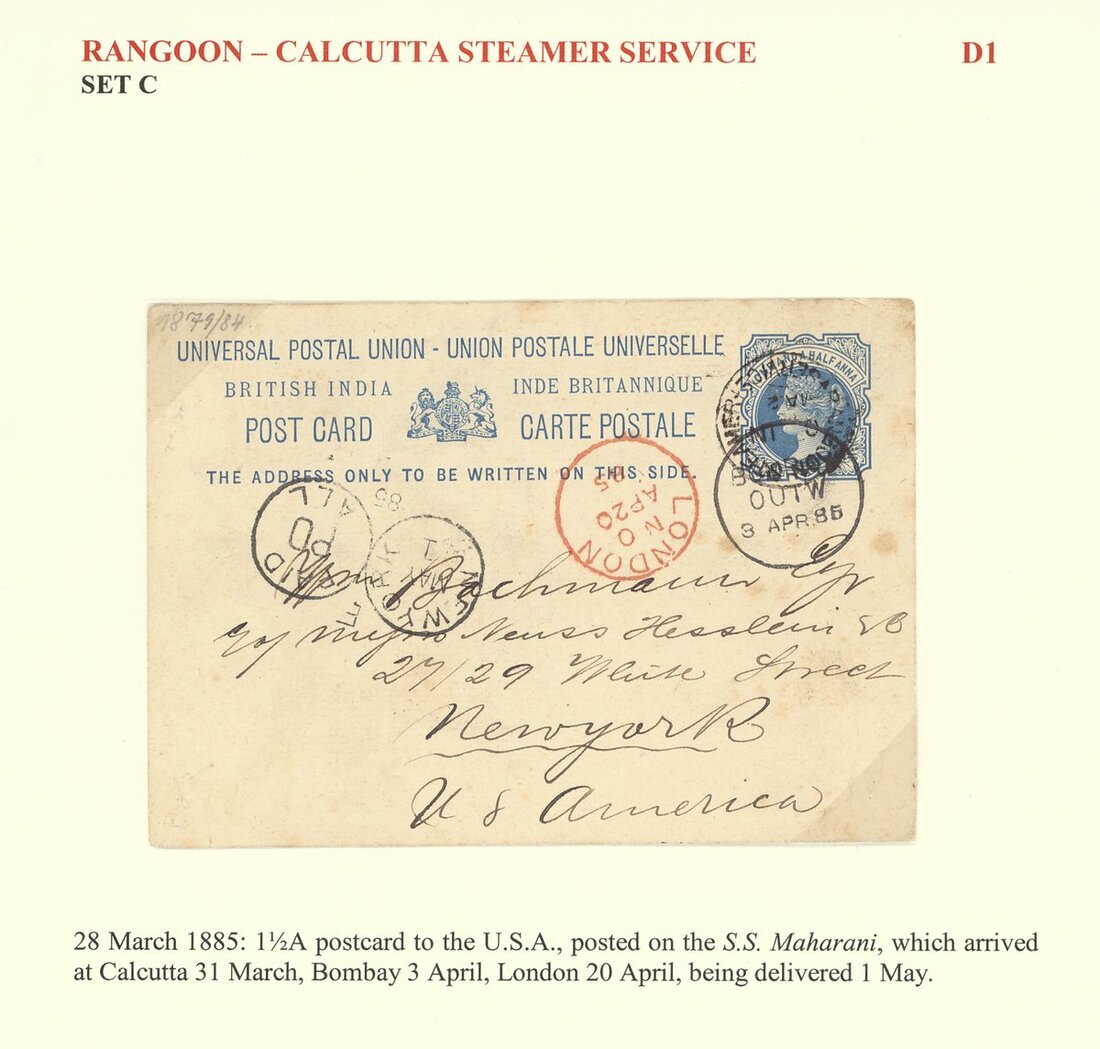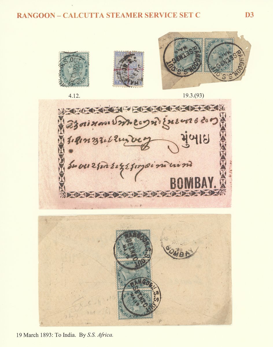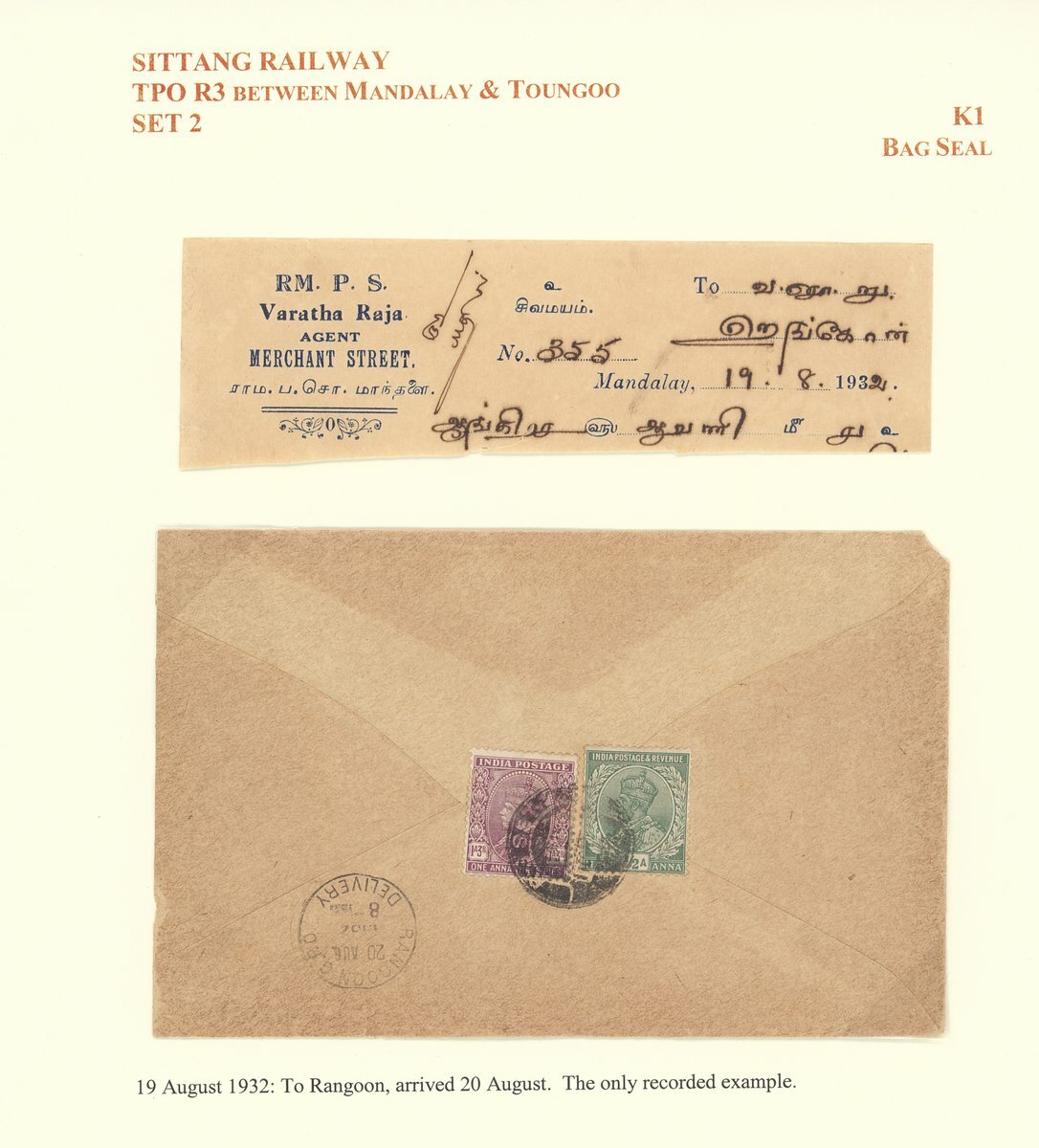 A group of envelopes and cards, variously addressed and franked, showing a range of datestamps including Rangoon-Calcutta Steamer Service Set A Type D1, Set C Types D1 and D3; R1 Set 1 Type D2, Set 2 Type Type D4 (5) and Set 4 Type D2; R2 Set 4 intaglio mail bag seal; R3 Set 2 intaglio mail bag seal Type K1; R4 Set 1 Types D1 (2), D3 (3) and D4, Set 2 Type D1, D3 (4) and D4 (2), Set 3 Types D2 (2), D3 (4) and D4; and R5 Set 2 Type D2 (2). A good lot well worth careful examination