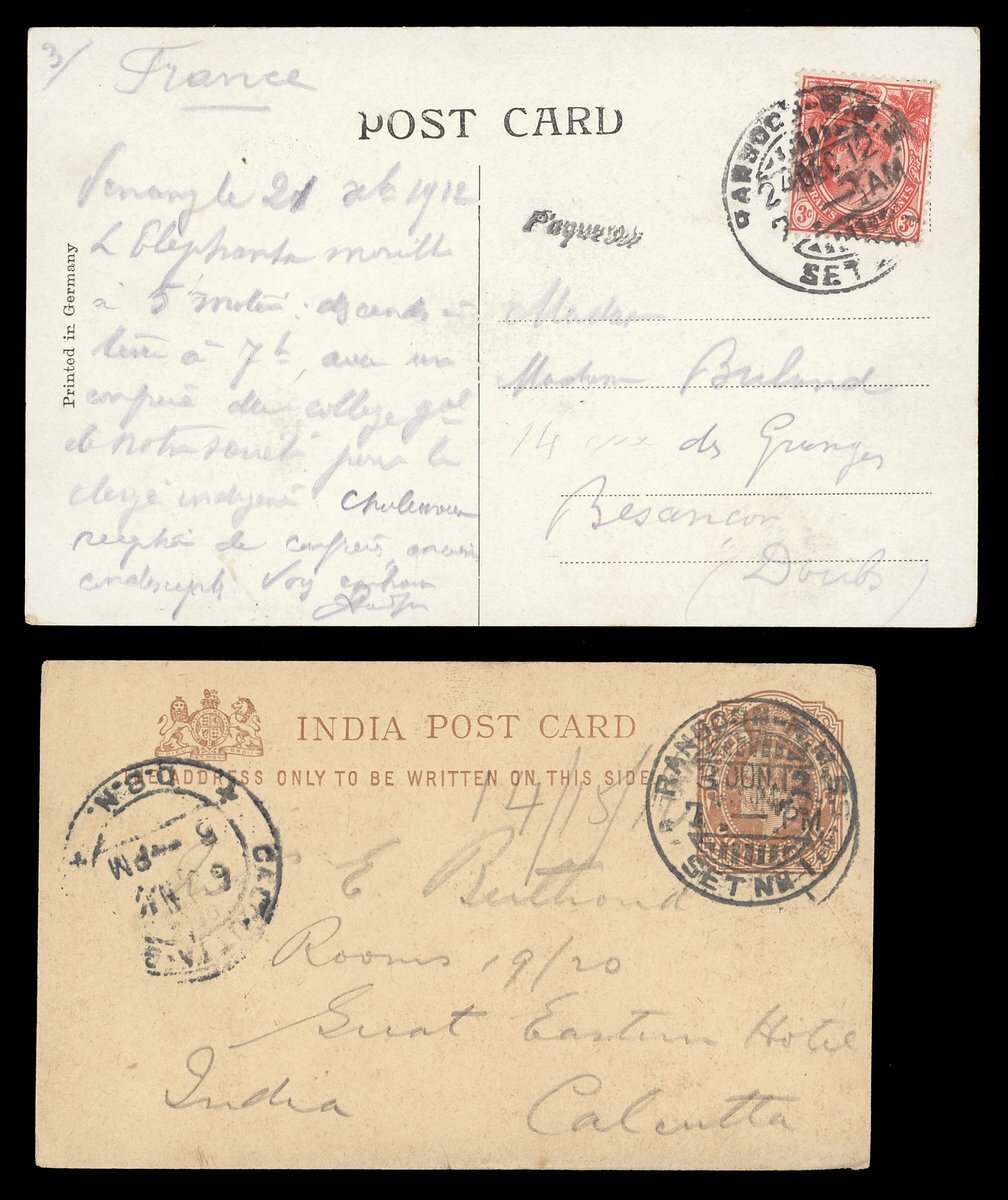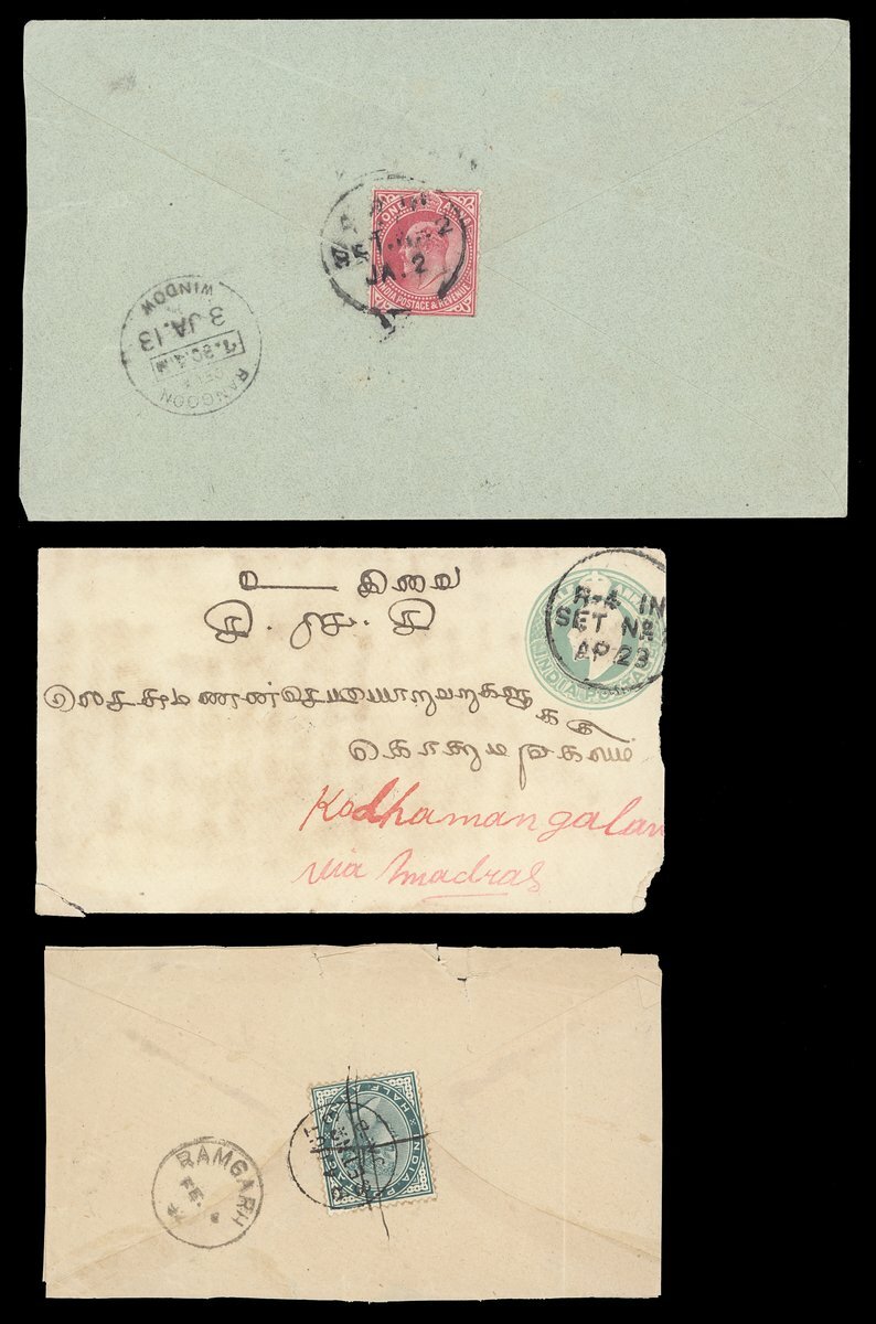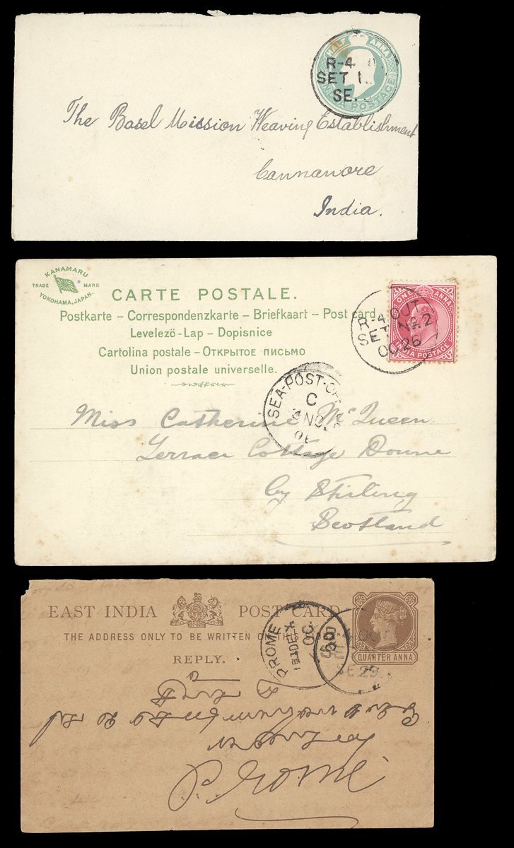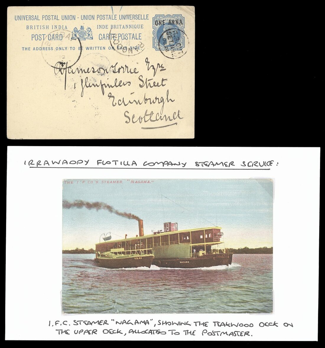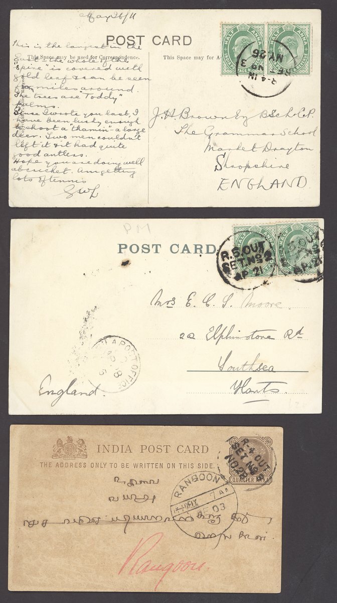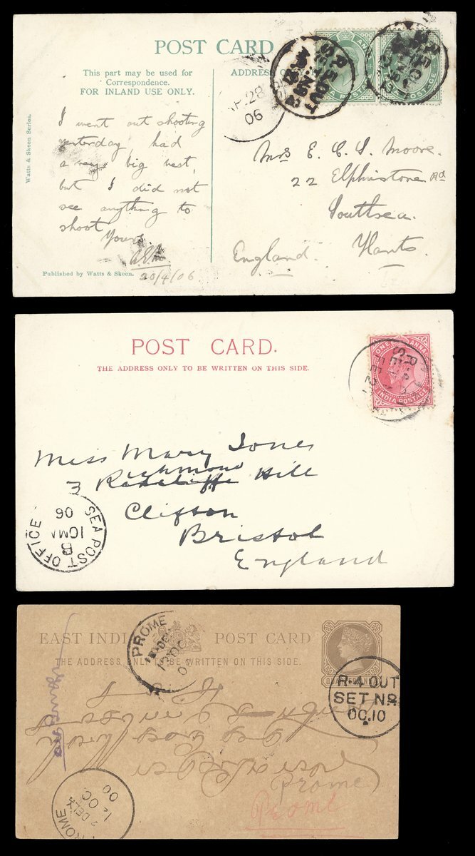 A group of envelopes and cards, variously addressed and franked, showing a range of datestamps including Rangoon-Calcutta Steamer Service Set A Type D1, Set C Types D1 and D3; R1 Set 1 Type D2, Set 2 Type Type D4 (5) and Set 4 Type D2; R2 Set 4 intaglio mail bag seal; R3 Set 2 intaglio mail bag seal Type K1; R4 Set 1 Types D1 (2), D3 (3) and D4, Set 2 Type D1, D3 (4) and D4 (2), Set 3 Types D2 (2), D3 (4) and D4; and R5 Set 2 Type D2 (2). A good lot well worth careful examination