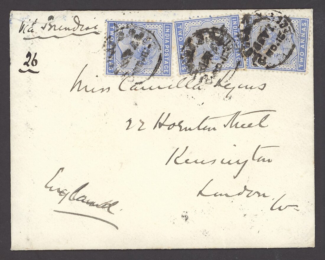 1890 (15 Nov.) envelope to London, marked "Via Brindisi", bearing 2a. (3) each cancelled by legible
