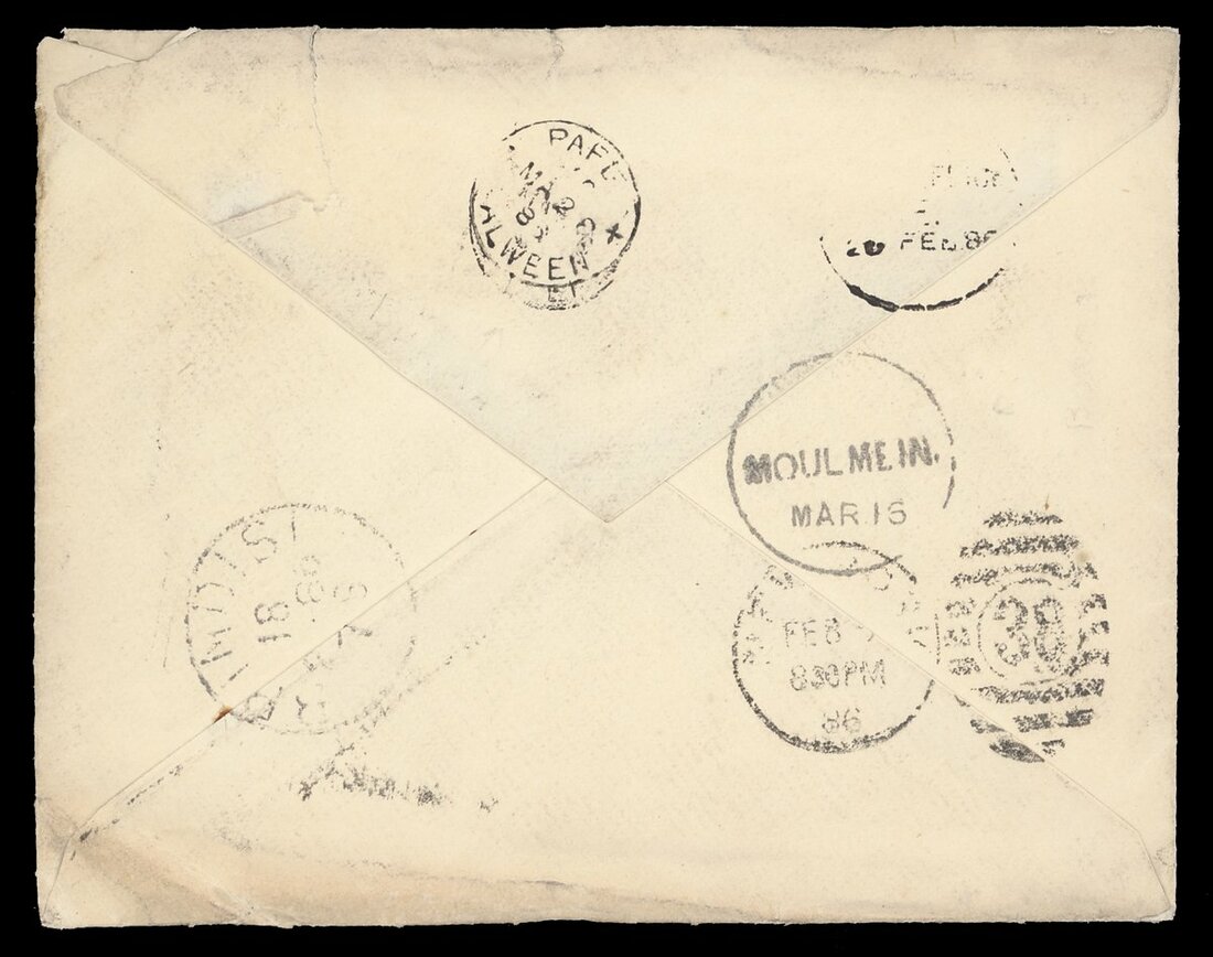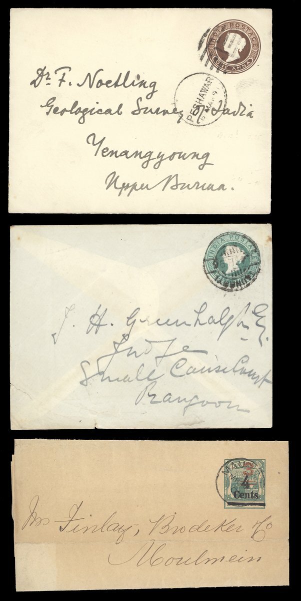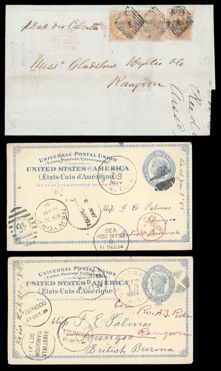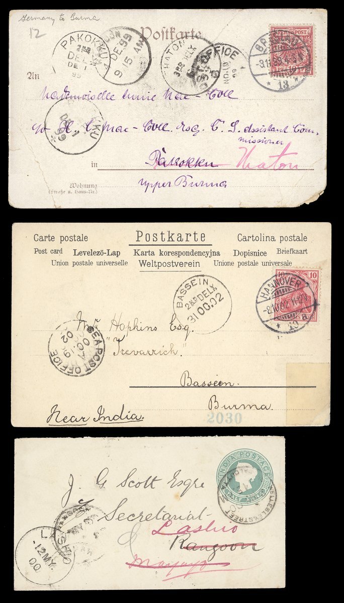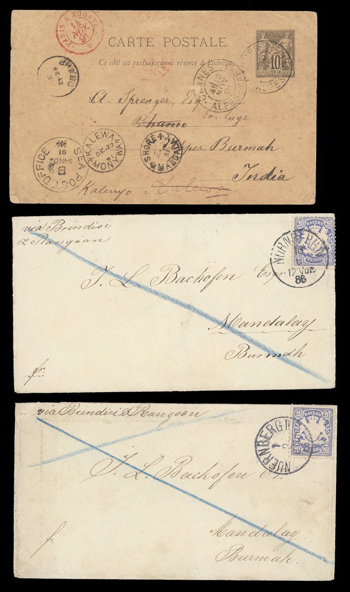1838-1904 with mail from Cape of Good Hope (3), France, Germany (3), India (12), Mauritius and USA (9) showing a range of arrival/transit datestamps including those of Kalewa Monya, Kawkareik, Lashio, Mayawaddy Amherst, Maymo, Papun and Sagaing Delivery. An interesting lot worth examination