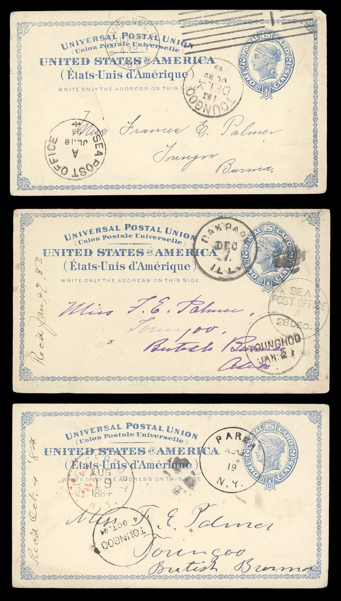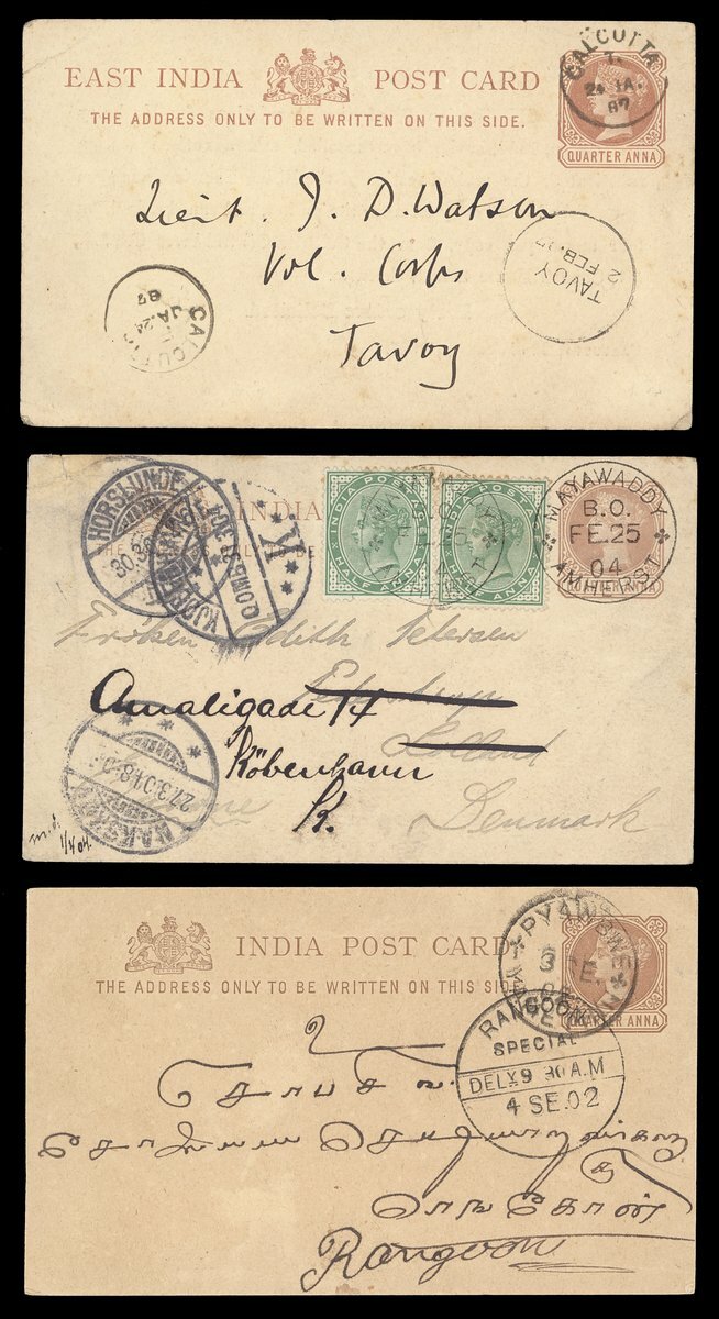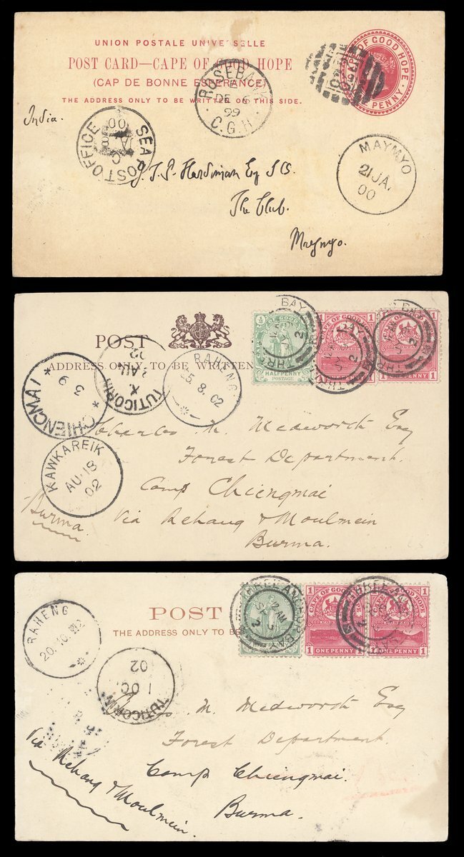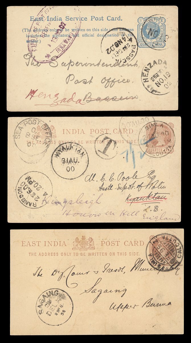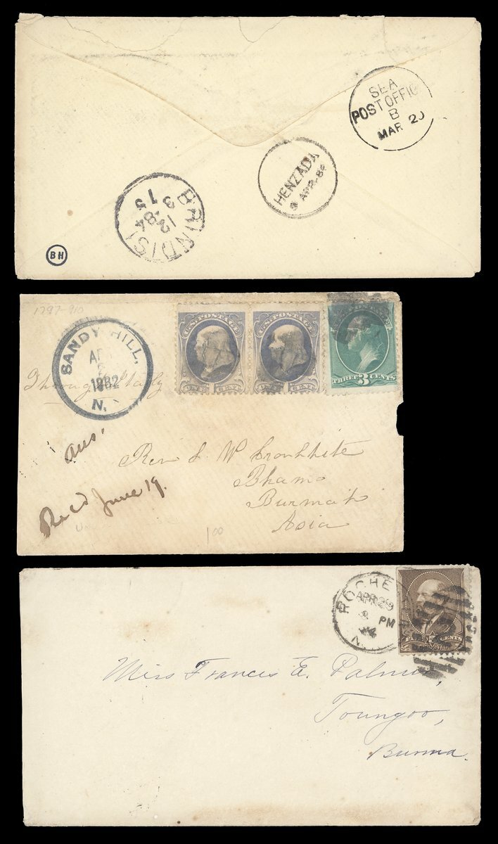 1838-1904 with mail from Cape of Good Hope (3), France, Germany (3), India (12), Mauritius and USA (9) showing a range of arrival/transit datestamps including those of Kalewa Monya, Kawkareik, Lashio, Mayawaddy Amherst, Maymo, Papun and Sagaing Delivery. An interesting lot worth examination