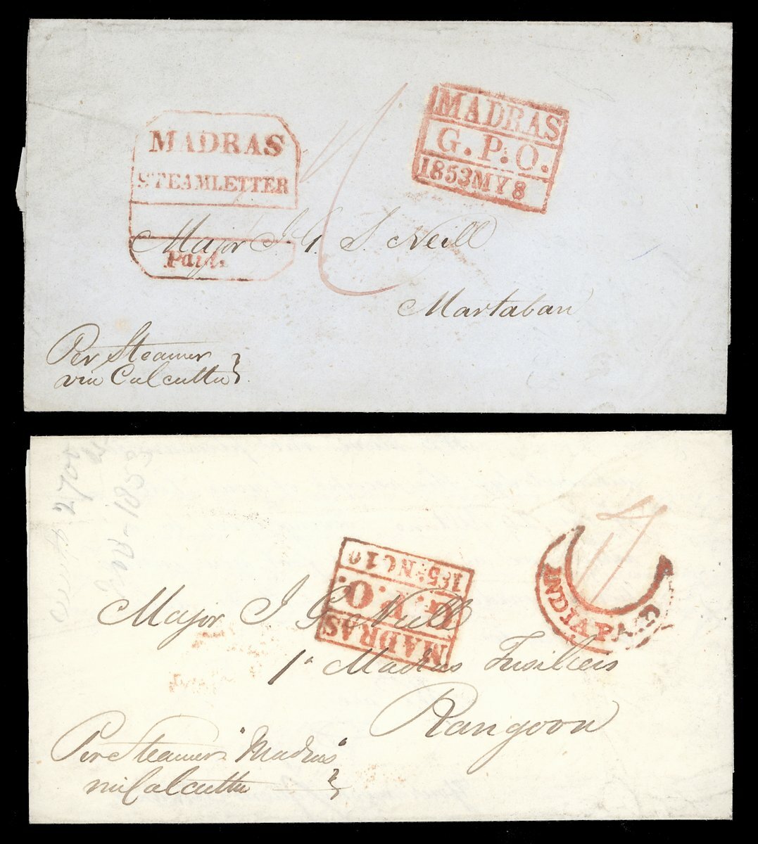 1853 (8 May) entire from Madras to Martaban, marked "Per Steamer via Calcutta", showing Madras G.P.O. and Madras Steam Letter Paid with, on reverse, Calcutta Ship Letter Free c.d.s., all in red; and 1853 (10 Nov.) entire from Madras to Rangoon, marked "Pr Steamer 'Madras' via Calcutta", showing crescent framed