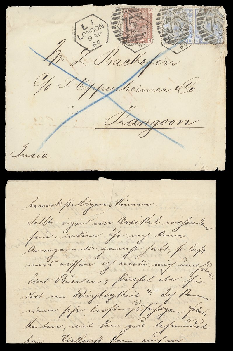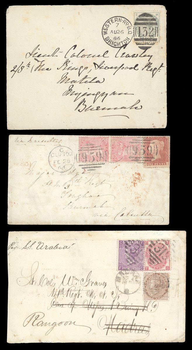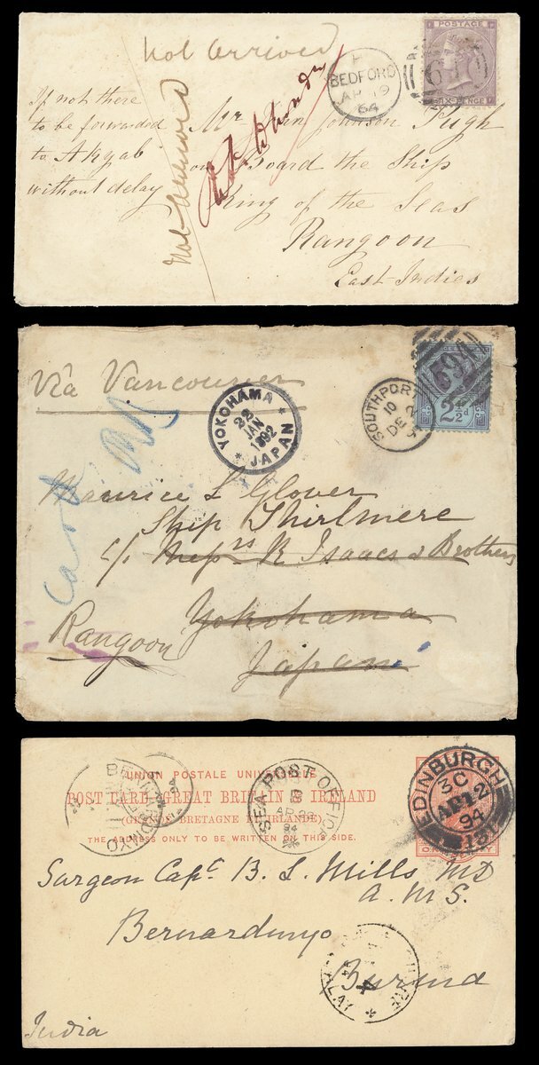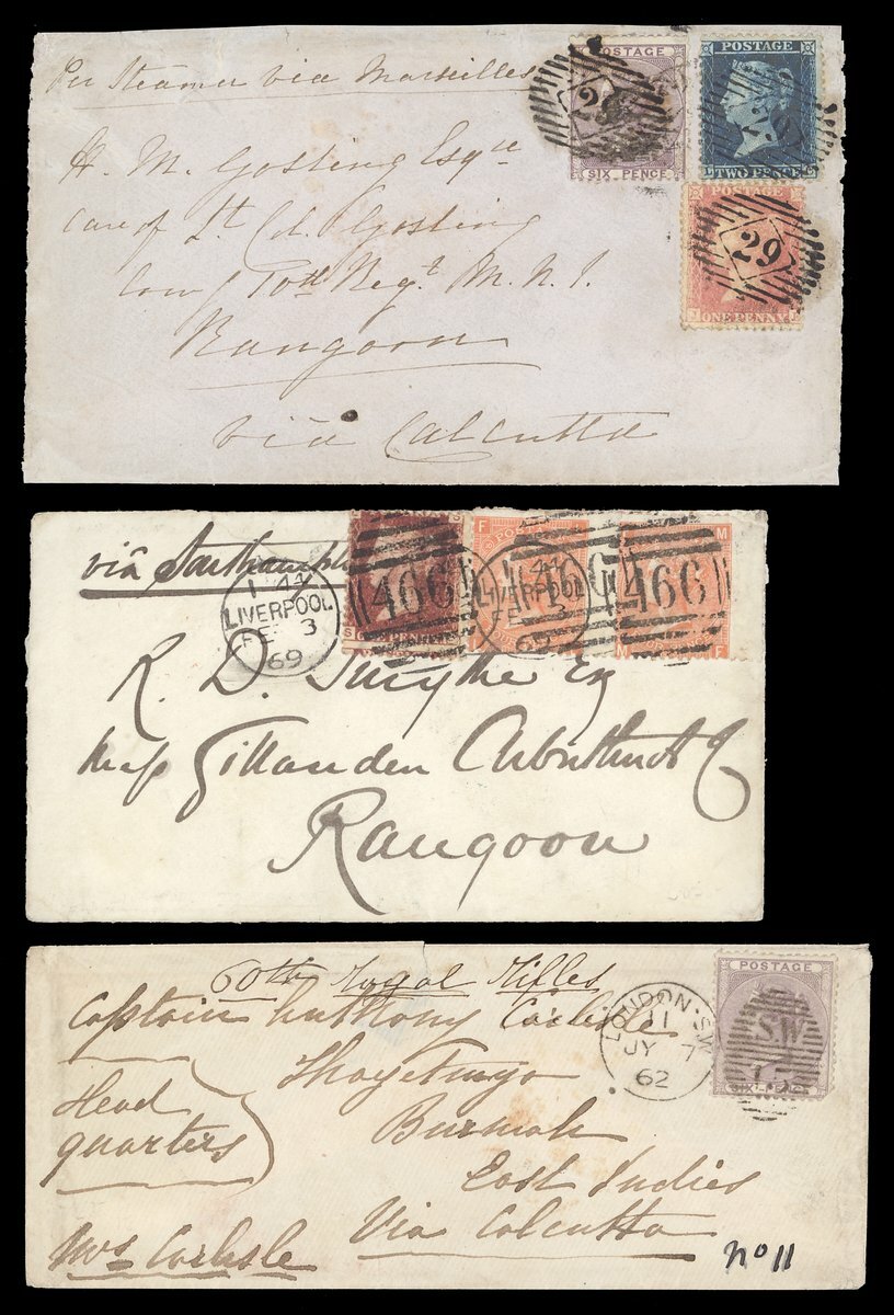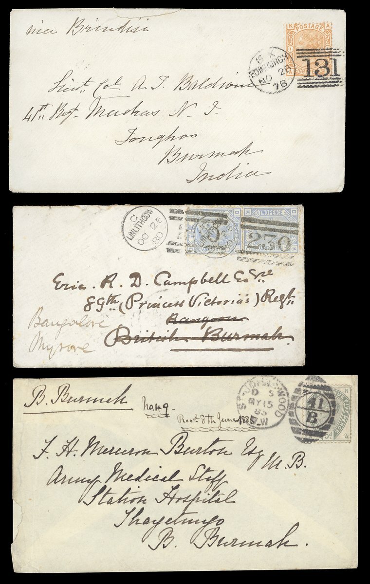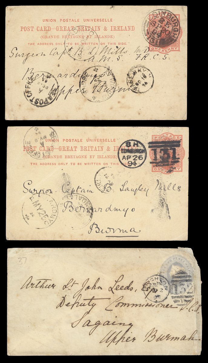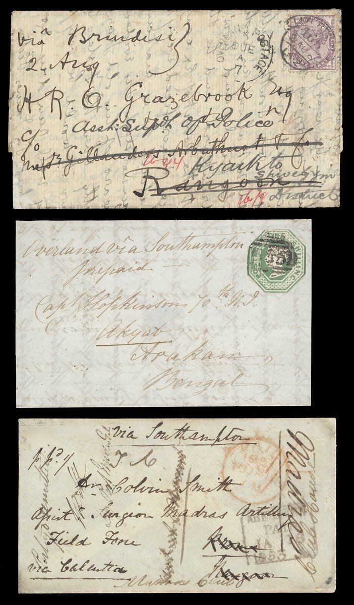 1854-1902 envelopes (14), stationery cards (3) and a front, all from UK, variously addressed and including frankings of 5d. (3), 6d. (3), 8d. and 9d. (4), one with Rangoon framed