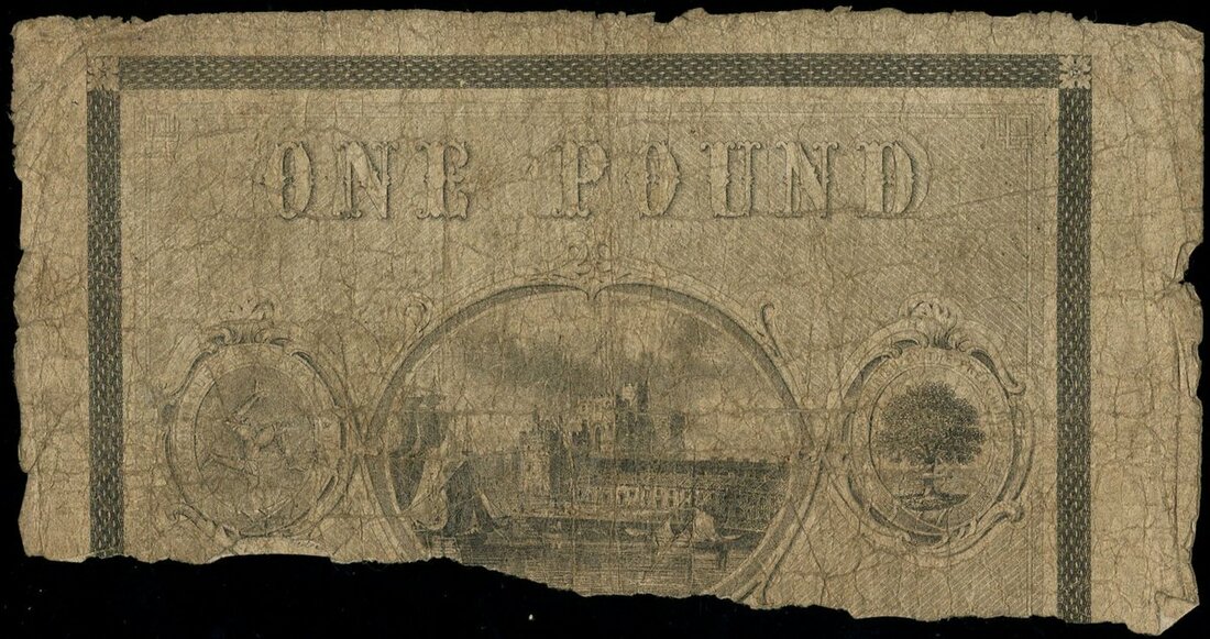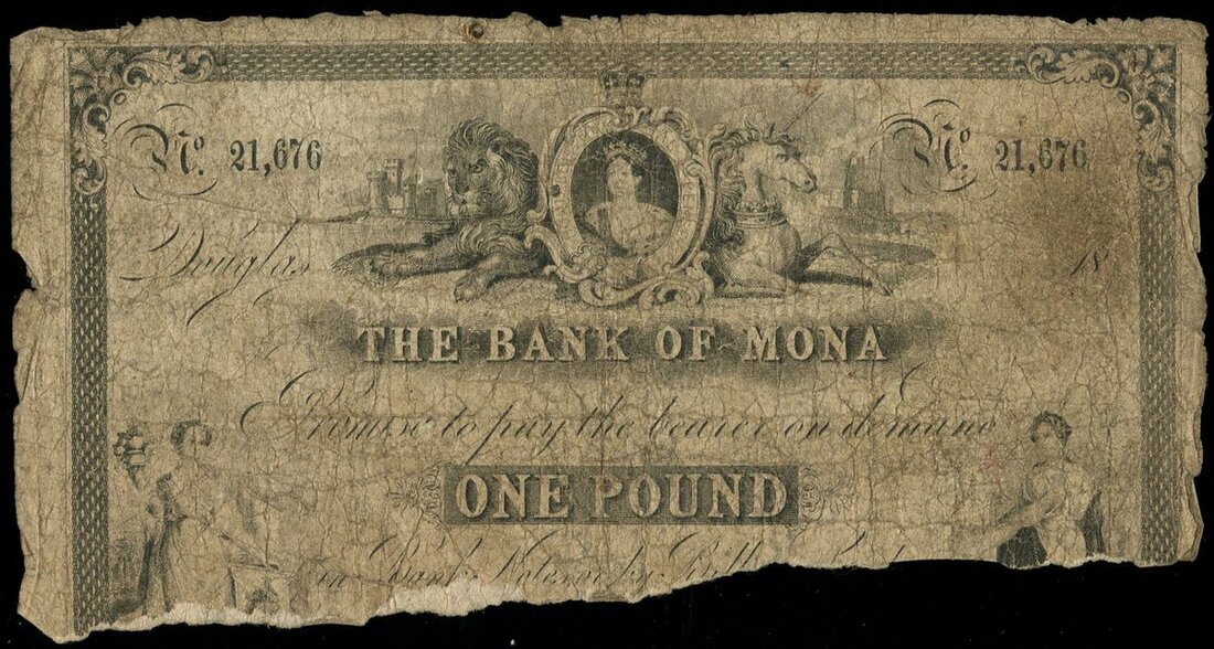 Isle of Man, The Bank of Mona, £1, ND (ca. 1849 - '56), serial number 21,676, black with portrait of Queen Victoria flanked by lion and unicorn at upper-centre, ornamental border and allegorical female figures at lower left and right corners, reverse border and seal, view of Castle Rushen and tree (arms of city of Glasgow) from left to right respectively,