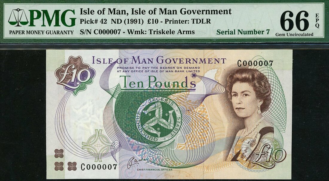 (x) Isle of Man Government, £10, ND (1991), serial number C000007, (Pick 42, TBB B116a, IOMPM M536), first prefix for type, in PMG holder 66 EPQ Gem Uncirculated, number 7!