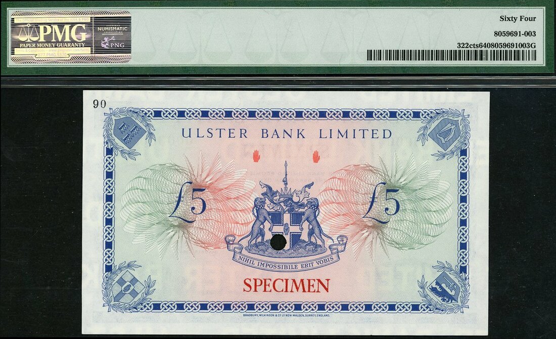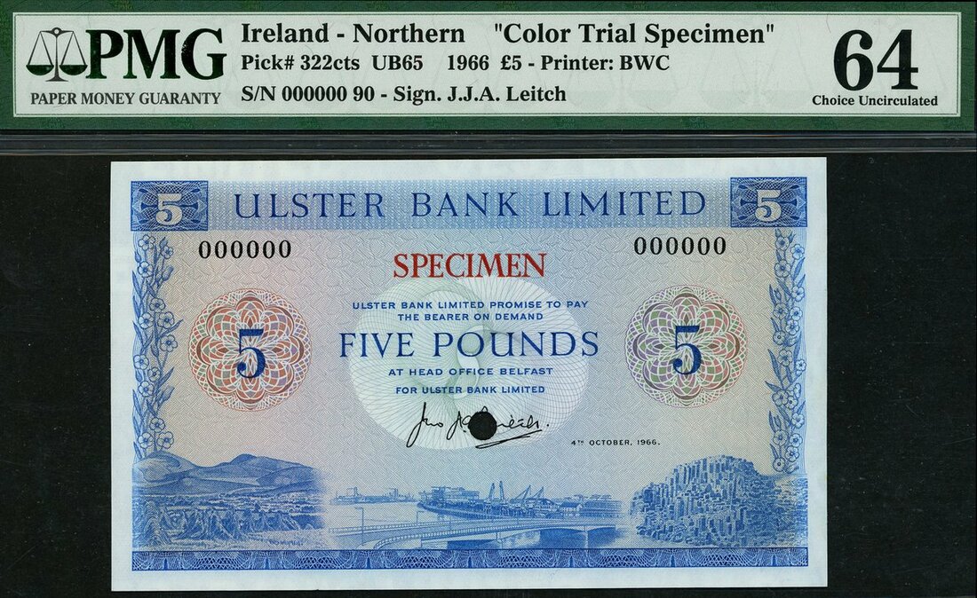 (x) Ulster Bank Limited, Northern Ireland, colour trial £5, 4 October 1966, blue,
