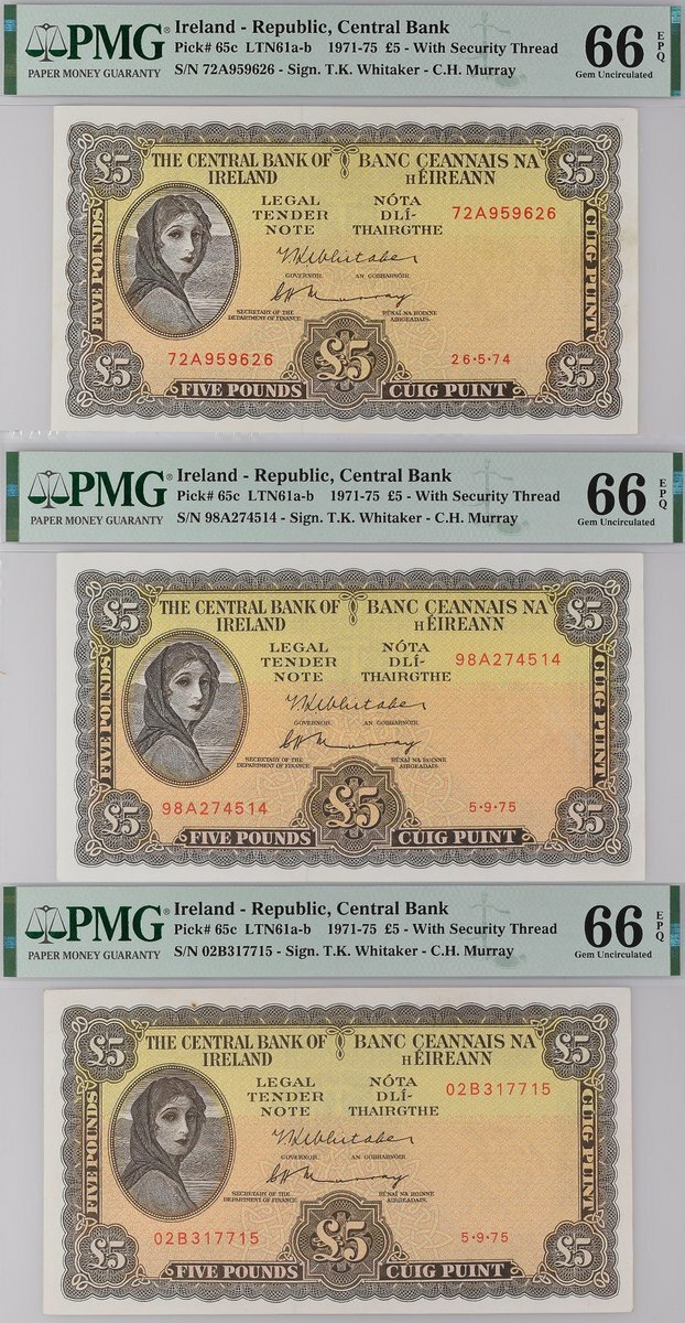 Central Bank of Ireland, £5 (3), 1974, 1975, signature Whitaker,