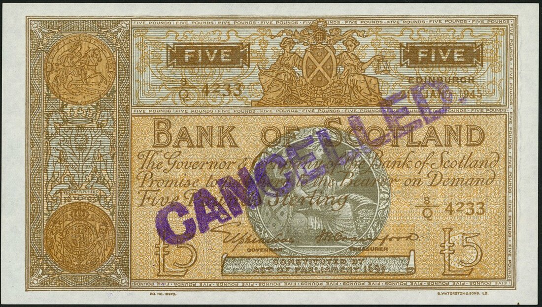 (x) Bank of Scotland, cancelled £5, 21 January 1945, serial number 8/Q 4233, (PMS BA102b), about uncirculated, rare