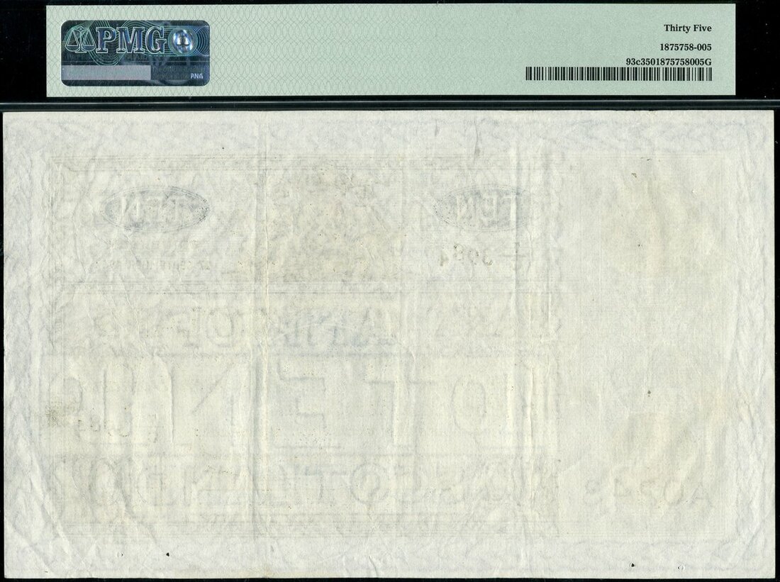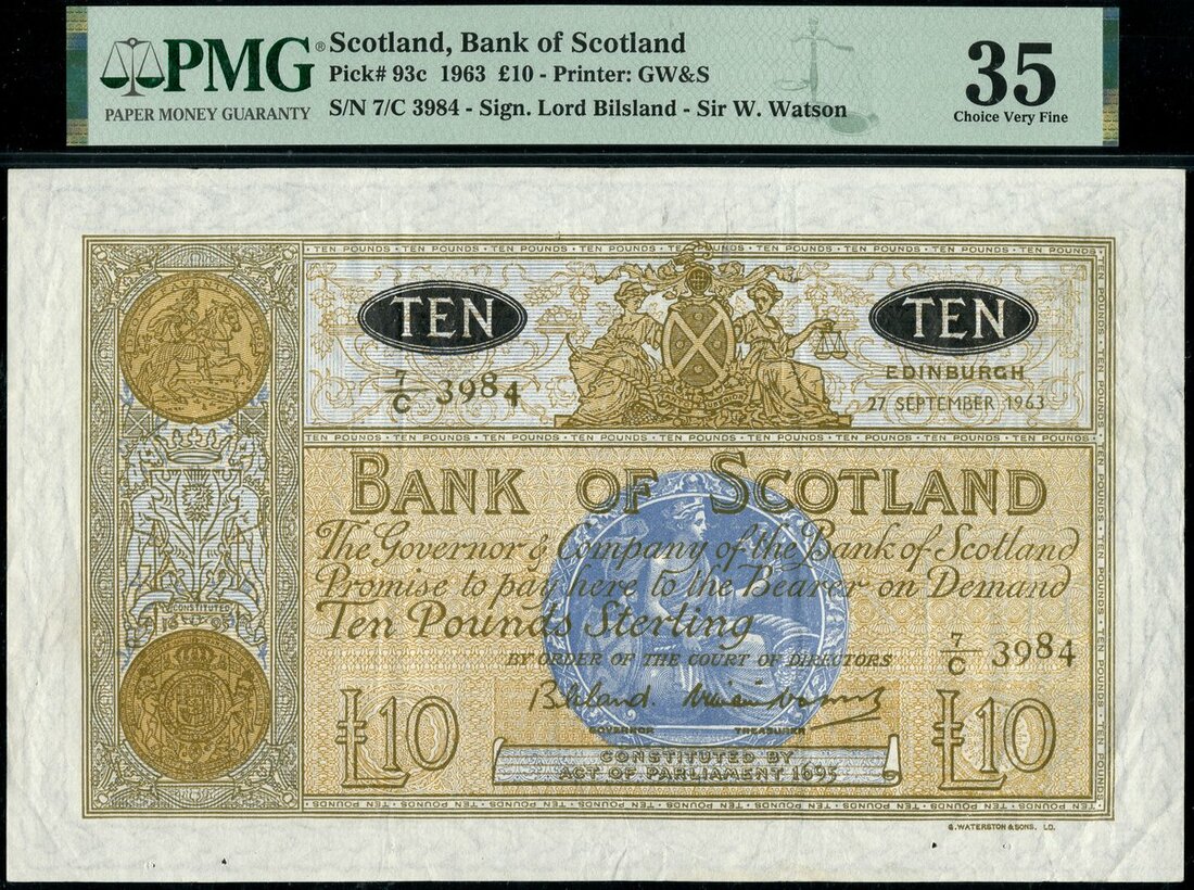 (x) Bank of Scotland, £10, 27 September 1963, serial number 7/C 3984, (Pick 93c, PMS BA108c), last date of the Bank of Scotland large size £10 notes, 5000 printed for this date. In PMG holders 35 Choice Very Fine, scarce