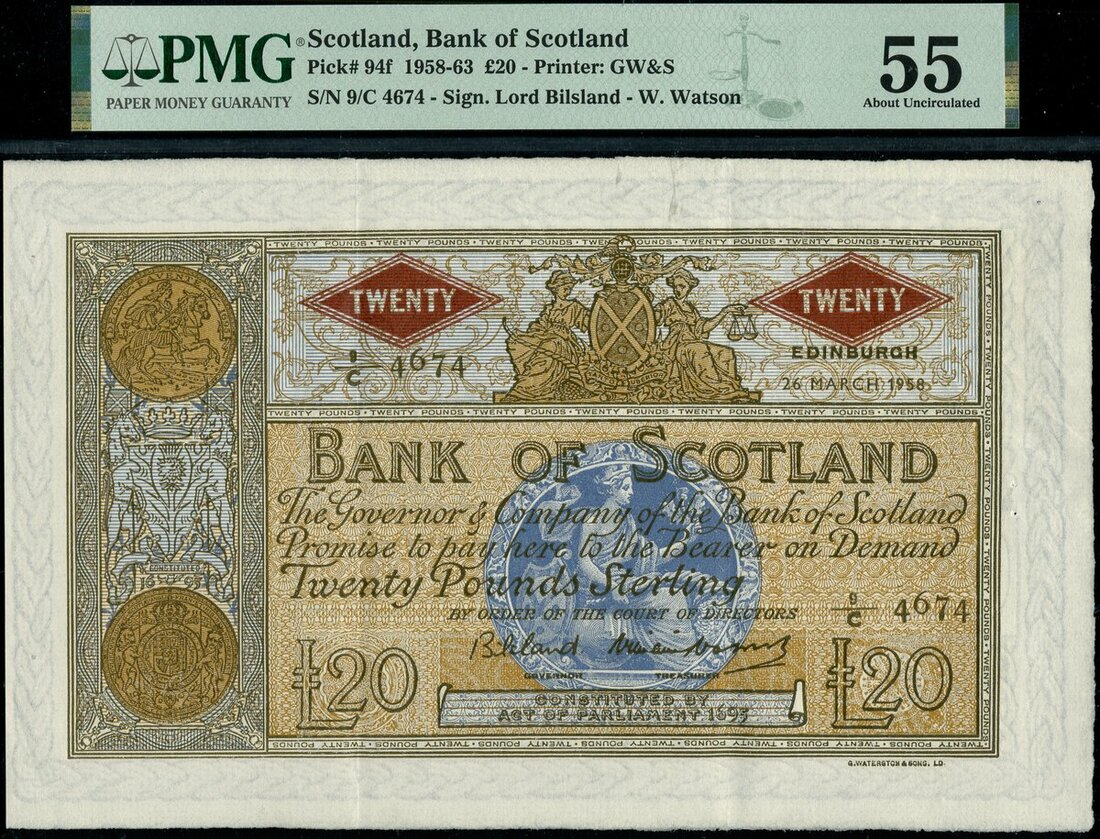 (x) Bank of Scotland, £20, 26 March 1958, serial number 9/C 4674, (Pick 94f, PMS BA109f), in PMG holder 55 About Uncirculated