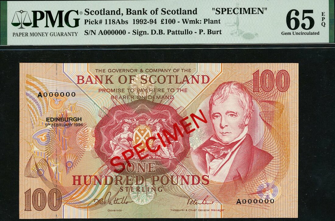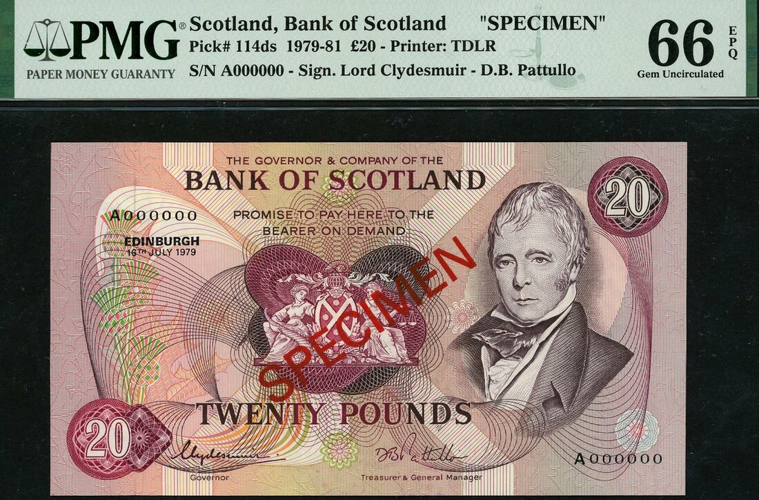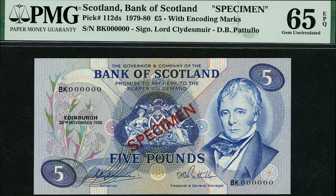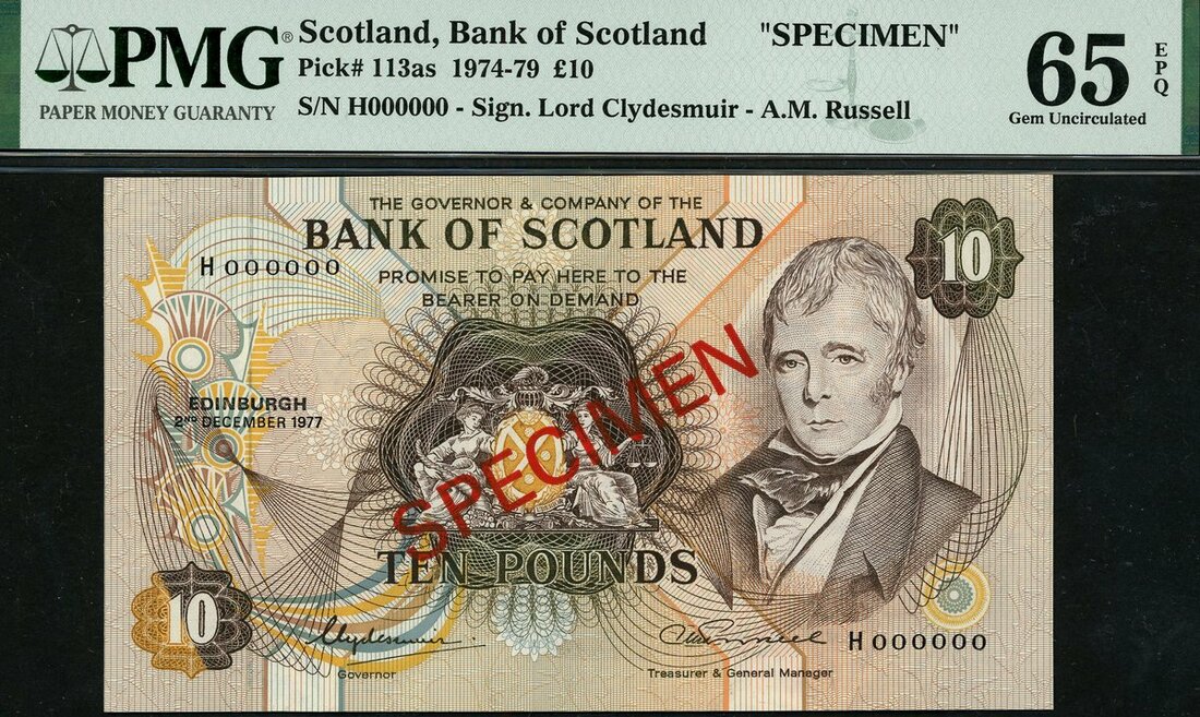 (x) Bank of Scotland, a set of specimen from 1970-94 issue, including £5, 1980, prefix BK, £10, 1977, prefix H, £20, 1979, prefix A, £100, 1994, prefix A,