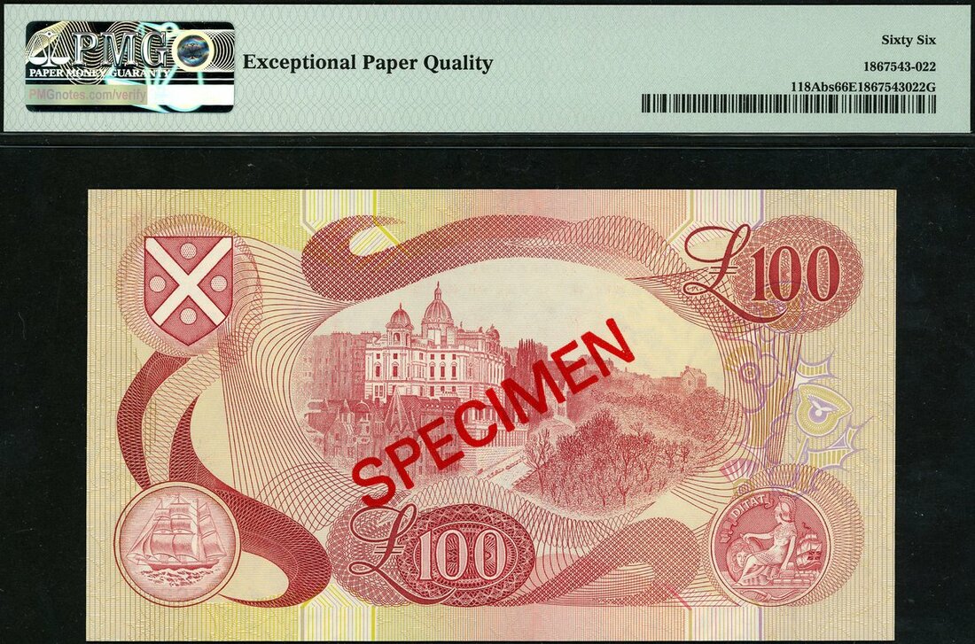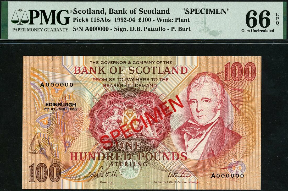 (x) Bank of Scotland, specimen £100, 2 December 1992, (Pick 118Abs, PMS BA121s), in PMG holder 66 EPQ Gem Uncirculated