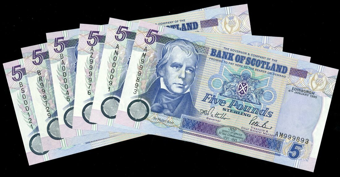 Bank of Scotland, £5 (6), 1995, 1996, 1998, 2002, serial numbers AM 999893, AN000091, AZ 999976, BA 000045, BR 999729, BS 000121,