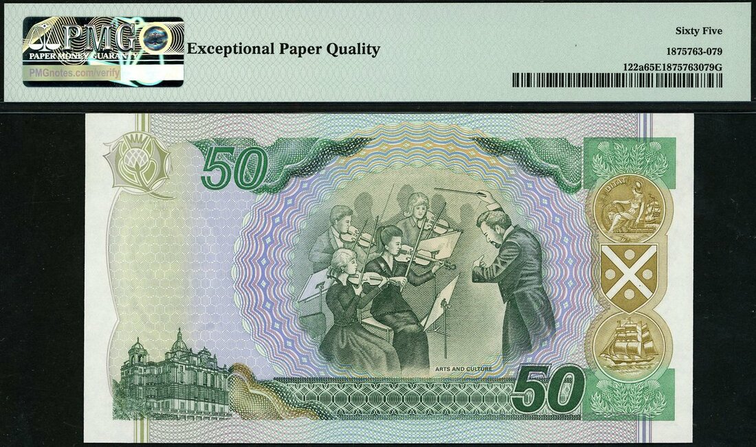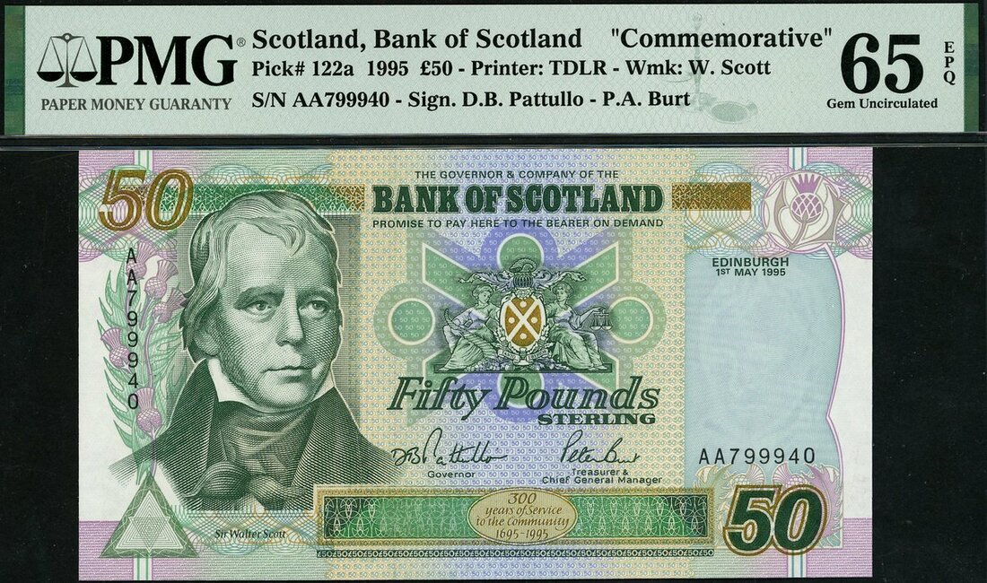 (x) Bank of Scotland, £50, 1 May 1995, serial number AA799940, (Pick 122a, PMS BA125a), in PMG holder 65 EPQ Gem Uncirculated