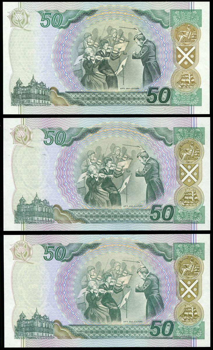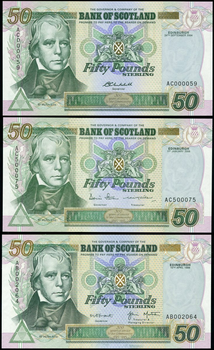 Bank of Scotland, £50 (3), 1999, 2004, 2006, serial numbers AB 002064, AC 000059, AC 500075, (PMS 125b, c, d, Pick 122b, c, d), 2006 issues starts from 500001, hence low number. Uncirculated (3 notes)