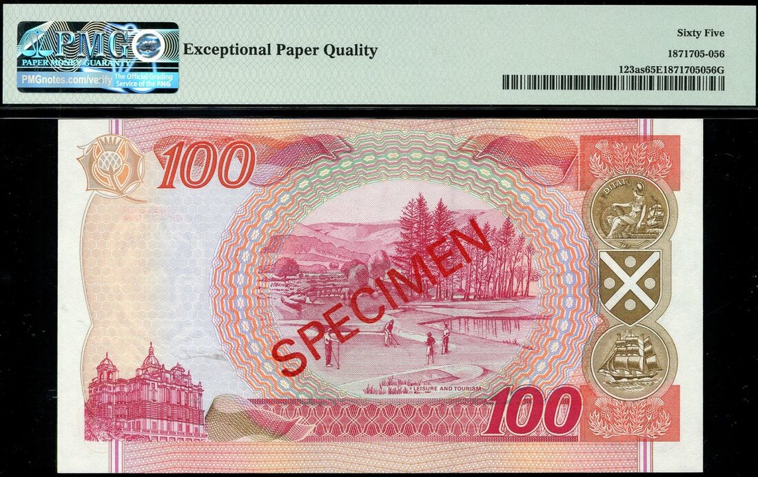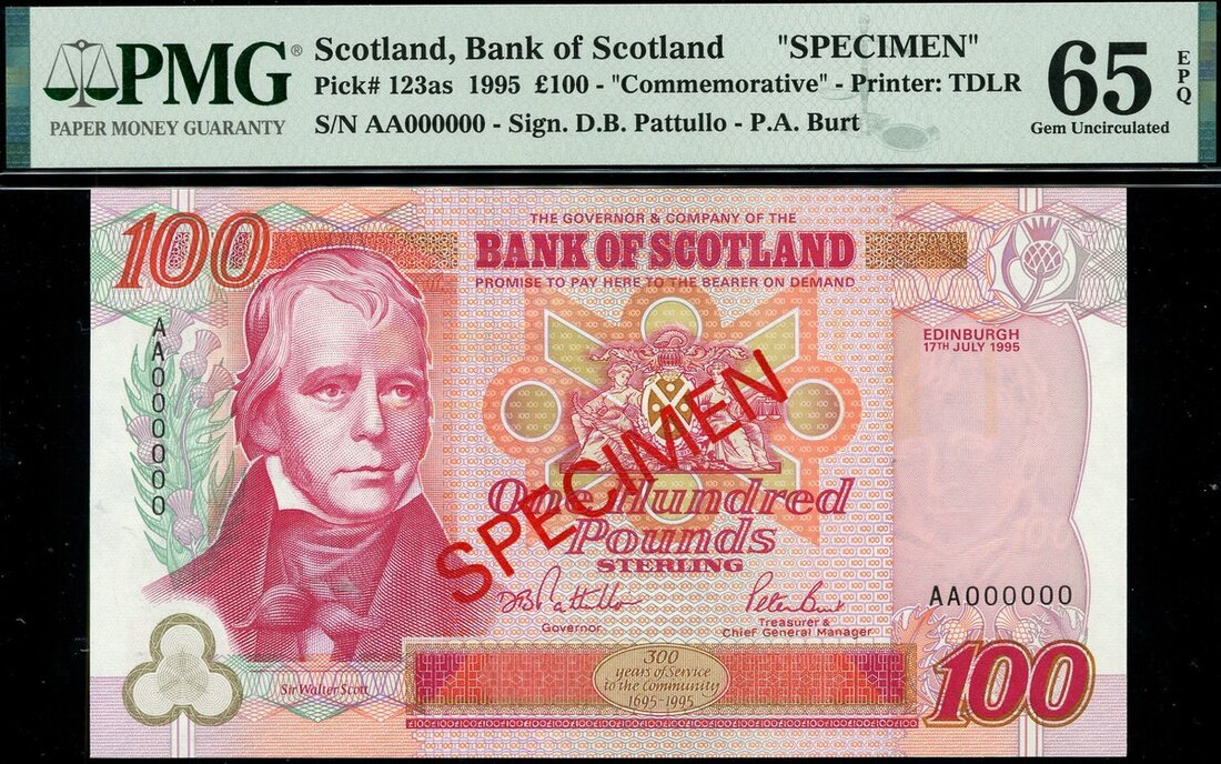(x) Bank of Scotland, 100 pounds, specimen, 17.7.1995, serial number AA000000, (Pick 123as), in PMG holder 65 EPQ Gem Uncirculated