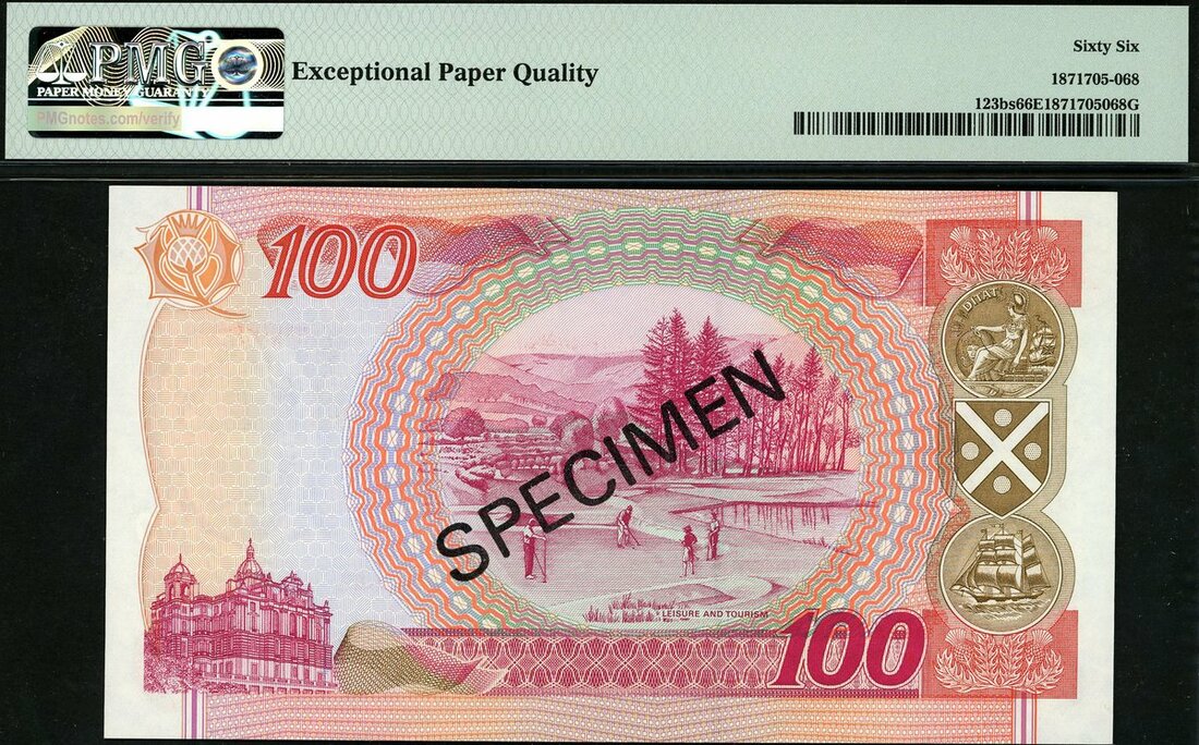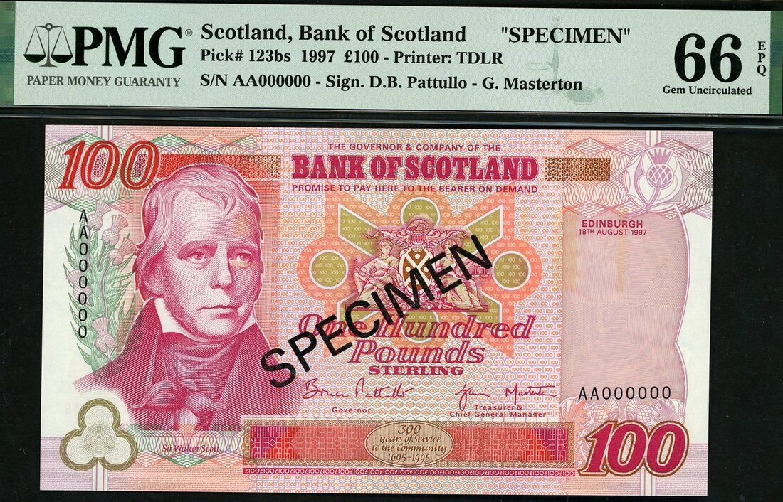 (x) Bank of Scotland, 100 pounds, specimen, 18.8.1997, serial number AA000000, (Pick 123bs), in PMG holder 66 EPQ Gem Uncirculated